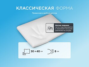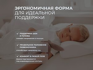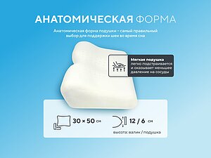 Читать полностью правильно подбирать высоту валика, от этого зависит степень комфортности сна. До этой подушки пользовалась другой, тоже эргономичной формы, но с высотой валика 14 см. Хотя подушка была очень качественная (фирмы Sissel), валик оказался высок, мышцы уставали. У этой же подушки валик идеально соответствует ширине плеча и, учитывая эффект "Антидавления", сон получился максимально комфортным. Встала отдохнувшей, со свежей головой.