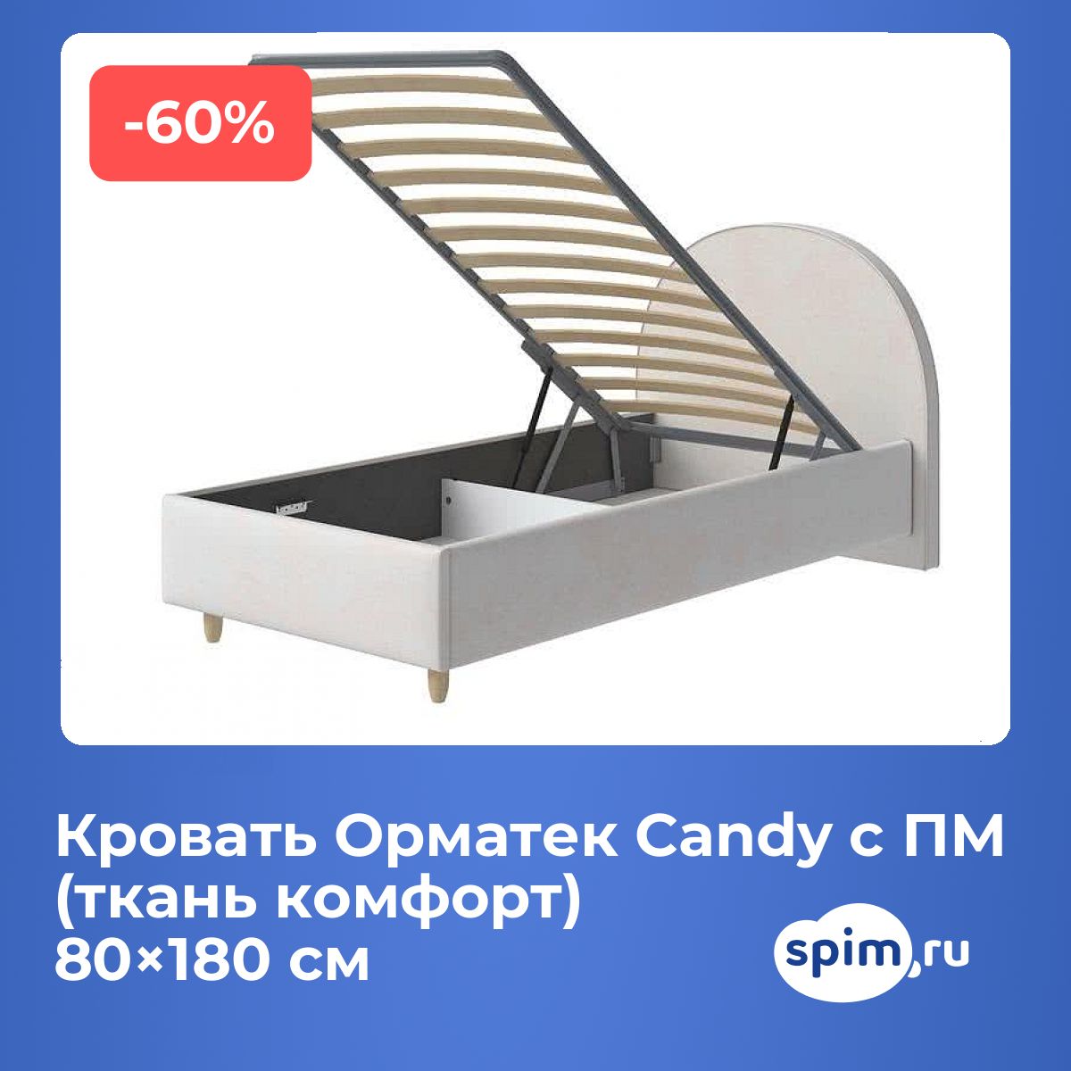 Кровать «Candy с ПМ (ткань комфорт)» с подъемным механизмом — это большой ящик для белья. Простой механизм подъема позволяет без усилий приподнимать основание для доступа к ящику.