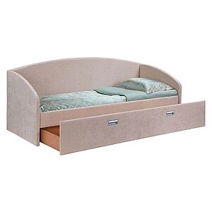 Каркас изготовлен из ДСП и ЛДСП. Обивка — искусственная кожа или мебельная ткань. Встроенное основание с березовыми ламелями (нагрузка до 120 кг). Кровать-софа с большим выдвижным ящиком для хранения (вне зависимости от размера спального места глубина ящика всегда 58 см, цвет внутреннего исполнения ящика Бук Бавария). Внешние габариты кровати: ширина + 8 см, длина + 7 см. Размер спального места, см: 80/90/120/140/160/180х190/200. Углубление под матрас, см: 5. Высота габаритная, см: 86. Высота изголовья, см: 75. Высота изножья, см: 75. Высота боковины от пола, см: 34. *В стоимость кровати не входят матрас и полка.