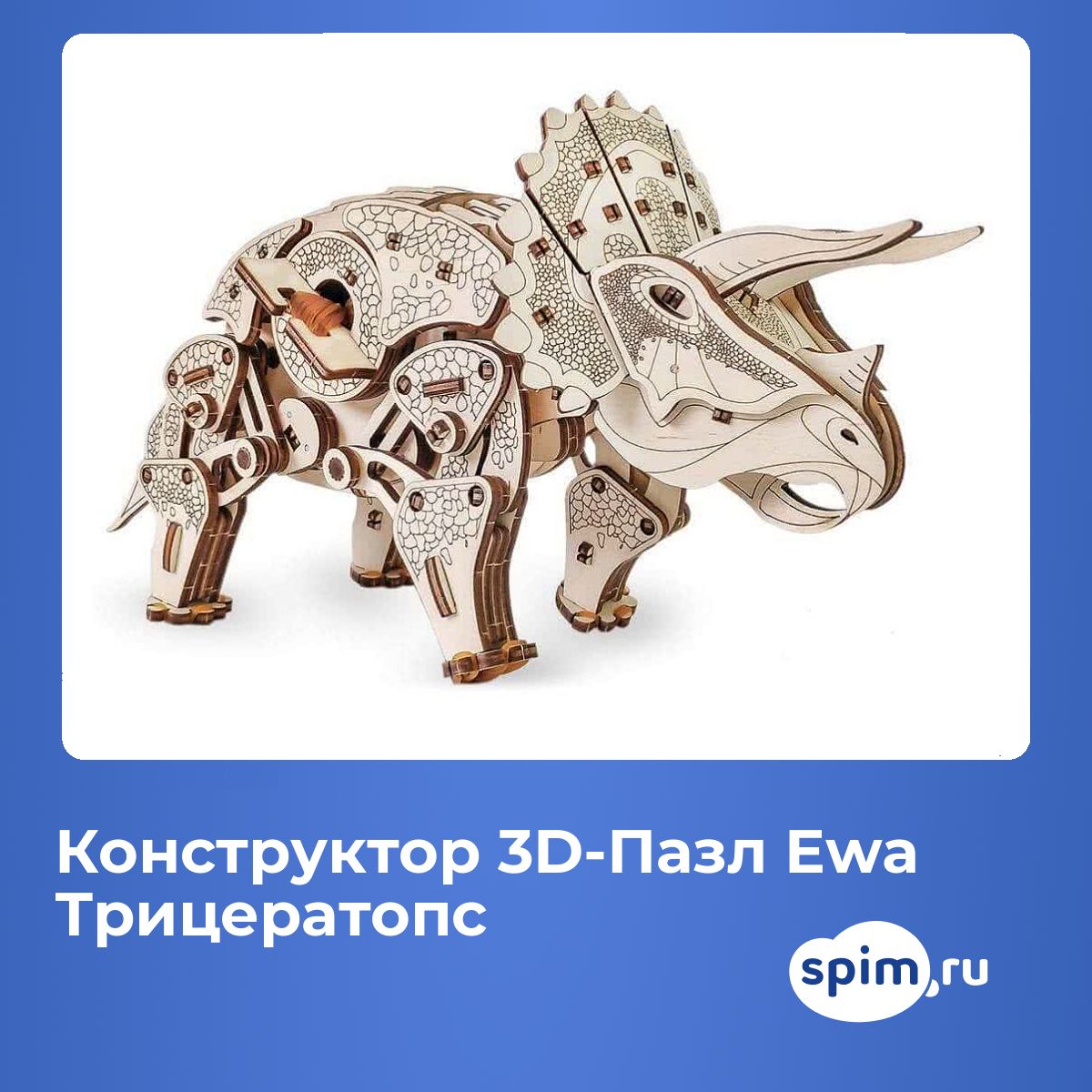 Механическая 3D-модель растительноядного динозавра существовавшего более 65 миллионов лет назад. Трицератопс самый известный из семейства крупных рогатых динозавров. Модель из экологически чистых материалов предназначена для самостоятельной сборки и имеет механизм который приводит в движение динозавра. Во время движения Трицератопс качает головой и эффектно виляет хвостом, чем вызывает бурю положительных эмоций у детей и взрослых. Идеальная игрушка, замечательный подарок и достойный предмет коллекционирования для дома и офиса! Механизм имеет ручную заводку и возможность запускать и останавливать модель!