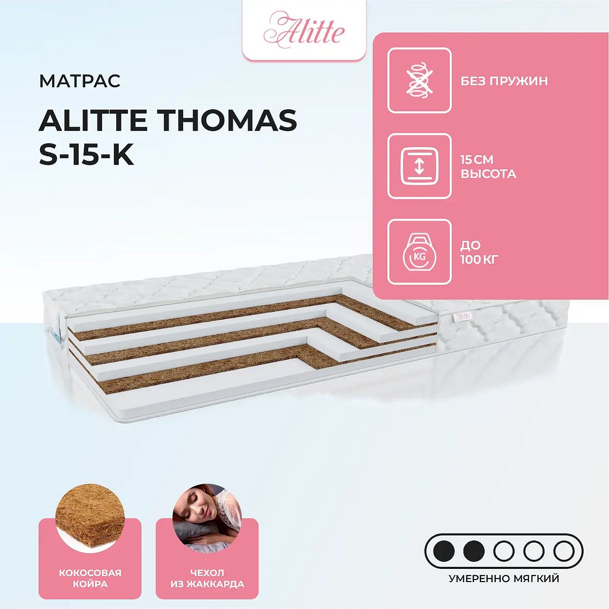 Средне-мягкий матрас «Alitte Thomas S-15-K» просто создан для настоящего ценителя комфорта. Такая модель отлично подойдет людям с небольшим весом.