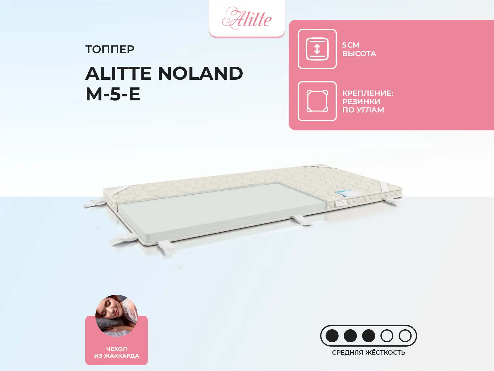 Матрас «Alitte Noland M-5-E» — средней жесткости, которая комфортна большинству людей среднего телосложения. Это — оптимальный вариант и детям, и взрослым, и пожилым людям.