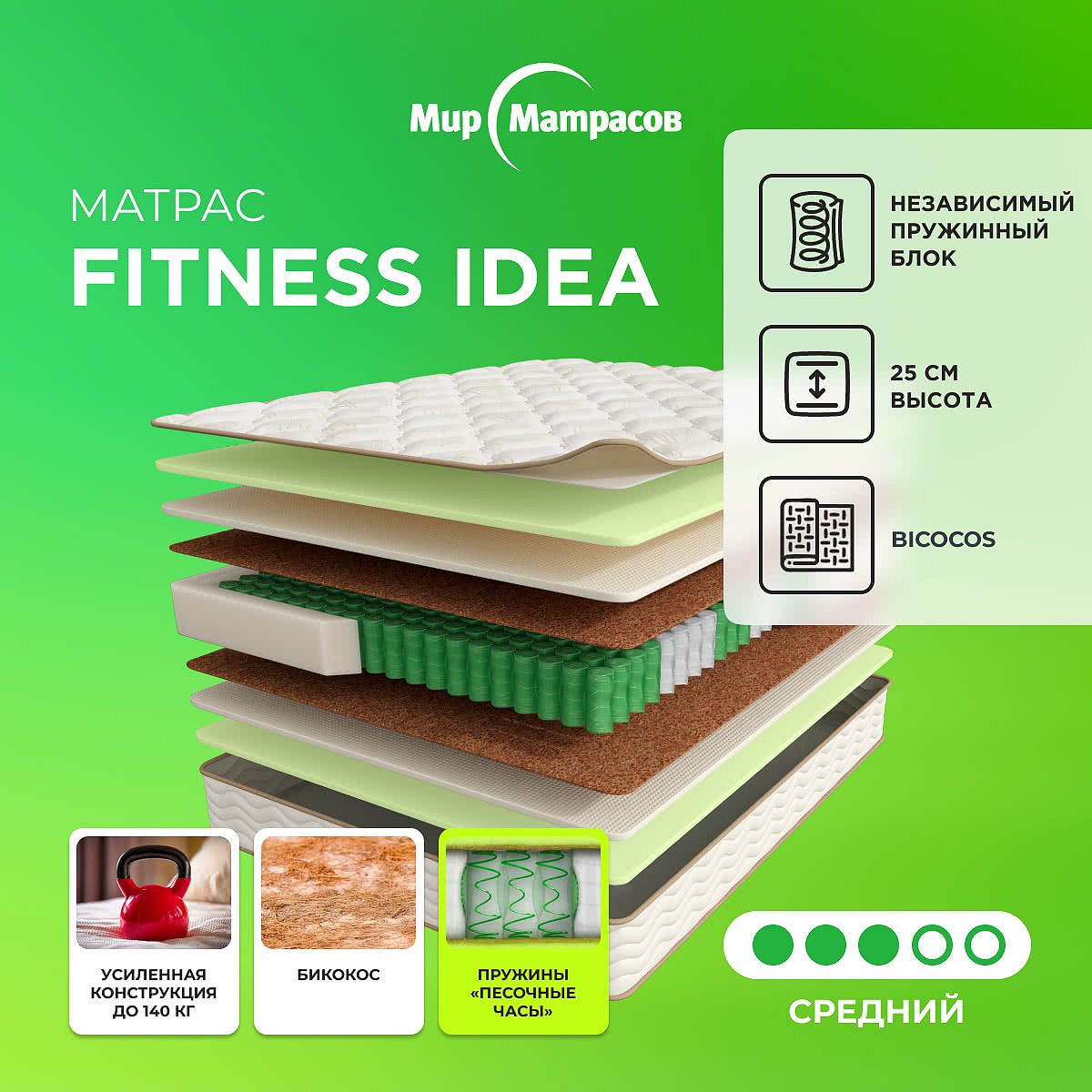 Матрас «Мир матрасов Fitness Idea» — средней жесткости, которая комфортна большинству людей среднего телосложения. Это — оптимальный выбор и детям, и взрослым, и пожилым людям.