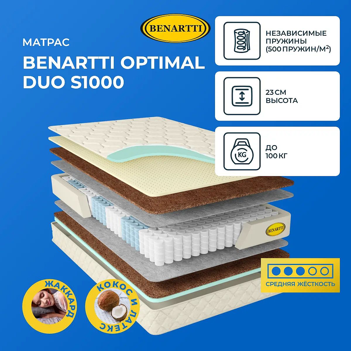 Максимальная нагрузка на спальное место, кг: до 100. Высота, см: 23. Наполнение моделиВ качестве материала для данной модели используются натуральные наполнители – кокосовая койра и натуральный латекс. Модель двусторонняя. Одна сторона выполнена на основе кокоса и латекса. Латекс способствует расслаблению тела, повышает тонус в мышцах и суставах, восстанавливает кровообращение. Вместе с кокосом латекс создает средне-жесткую поверхность, которая подойдет любому, независимо от его веса и возраста. Кокос обеспечивает надежную поддержку для всего тела, формирует правильные позы во сне. Другая сторона представлена слоем кокосовой койры.Действие пружин S1000Модель базируется на основе пружинного блока S1000. Такая конструкция характеризуется повышенным уровнем комфорта, создает анатомический эффект на поверхности. В основе блока 1000 пружин, по 500 на 1 кв. метр. Все пружины находятся в индивидуальных чехлах и воспринимают нагрузку точечно. Когда прогибается одна пружина, другая находится в покое, поэтому исключается провисание всего блока.Чехол из жаккардаВерхний слой модели – это жаккардовая ткань, простеганная на гипоаллергенном холлконе и искусственном латексе. Чехол обработан антибактериальной пропиткой, он несъемный.Защита матрасаДля защиты поверхности от загрязнений, попадания пыли и влаги на матрас рекомендуем купить защитный наматрасник-чехол или водонепроницаемый наматрасник.Другие моделиПосмотрите также другие модели с похожим наполнением: Benartti Optimal Max S1000, Benartti Optimal Hard S1000.