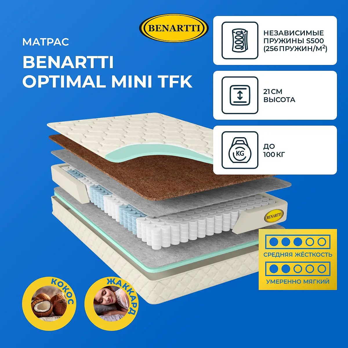 Максимальная нагрузка на спальное место, кг: до 100. Высота, см: 21. Наполнение моделиДвустороннее наполнение определяет наличие двух материалов в модели – это кокосовая койра и натуральный войлок. Кокос располагается с одной стороны и делает ее жесткой, а войлок – с другой, это более мягкая сторона.Сочетание кокоса и войлокаКокосовая поверхность способствует комфортному сну, правильному распределению нагрузки по поверхности, а также естественному положению тела во время сна. Кокос за счет входящих в него сухих волокон хорошо проводит воздух, а также быстро исправляет влагу с поверхности. Это гипоаллергенный и безопасный к использованию материал без запаха. Поверхность из войлока более мягкая, войлок хорошо проводит воздух, а также создает необходимый для здорового и спокойного сна теплообмен. Войлок - экологически чистый материал без запаха.Действие пружин TFKМодель базируется на блоке независимых пружин TFK. Его плотность – 256 элементов на 1 кв. метр. Каждый элемент-пружина помещен в отдельный чехол и не связан с соседним. Это позволяет пружинам воздействовать на тело точечно и гарантирует надежную анатомическую поддержку. По обеим сторонам блок прикрыт слоем войлока.Чехол из жаккардаВерхний слой модели – это жаккардовая ткань, простеганная на гипоаллергенном холлконе и искусственном латексе. Чехол обработан антибактериальной пропиткой, он несъемный.Защита матрасаДля защиты поверхности от загрязнений, попадания пыли и влаги на матрас рекомендуем купить защитный наматрасник-чехол или водонепроницаемый наматрасник.Другие моделиПосмотрите также другие модели с похожим наполнением: Benartti Optimal Hard TFK, Benartti Optimal Soft TFK.
