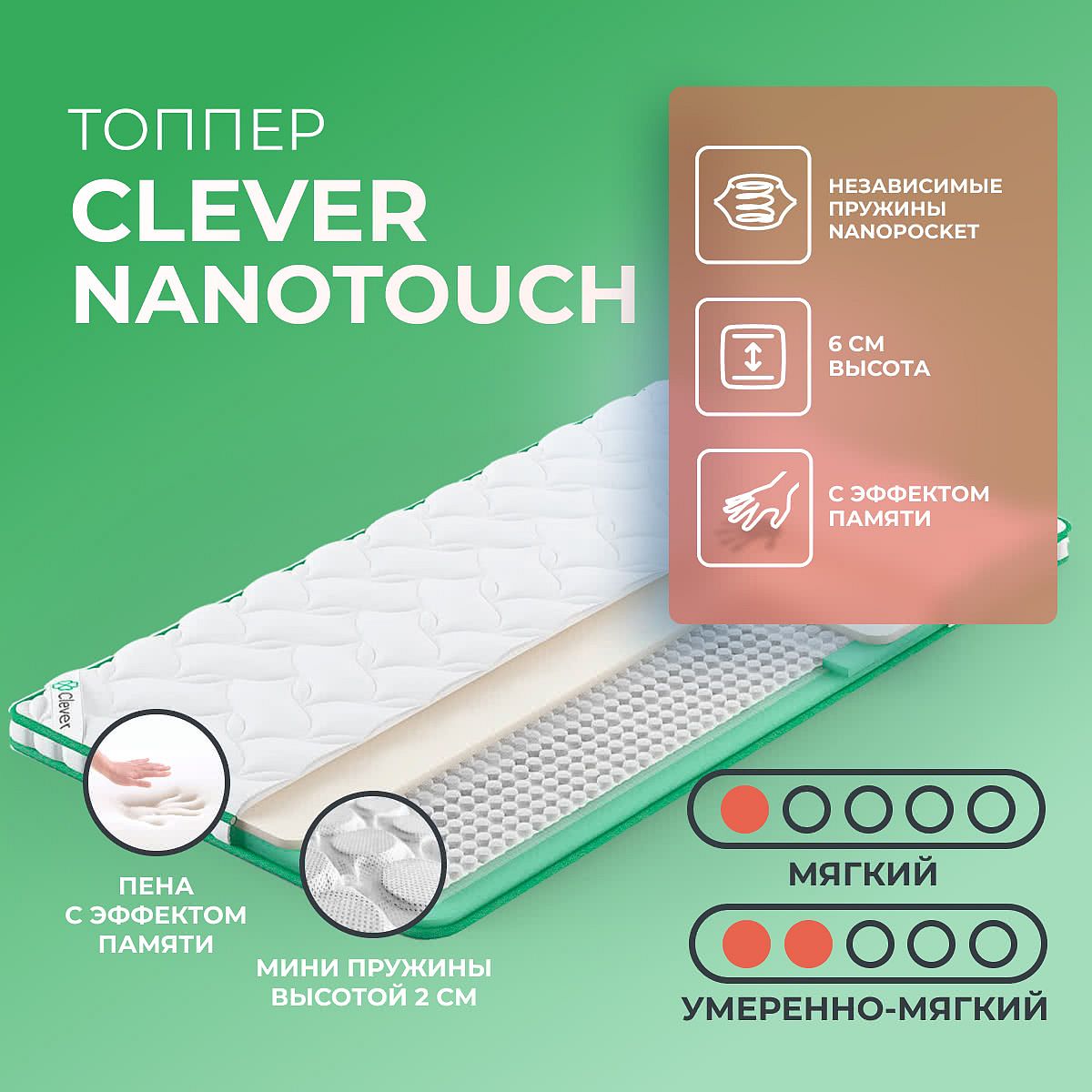 Дополнительное преимущество Nanopocket — отличная вентилируемость. Пружины делают топпер Clever NanoTouch намного более дышащим, обеспечивают комфортную анатомическую поддержку, улучшают ортопедический эффект и хорошо распределяют нагрузку по поверхности матраса.