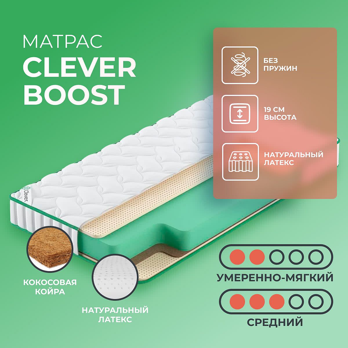 Нагрузка на спальное место, кг: 120. Высота, см: 19. Матрас скручен в рулон. Матрас Boost от Clever не содержит пружин. С ролью пружин отлично справляется блок современного пенополиуретана. За счет пористой структуры ППУ “дышит”, а состав его такой, что при всем желании он не сможет впитать влагу. Умеренно-мягкая сторона достигнута с помощью натурального латекса. Этот эластичный материал добывают путем вспенивания сока вечнозеленого дерева Гевеи. Сон на такой поверхности расслабляет, так как материал “умеет” подстроиться под рельеф спящего человека и неважно на каком боку он спит! Вторая сторона этой модели имеет среднюю жесткость и выполнена исключительно натуральными компонентами: кокосовой койрой и натуральным латексом. Слой кокоса дает ровную и жесткую поверхность, способен правильно поддерживать позвоночник, а латекс действует в роли смягчителя. В любой момент матрас можно перевернуть и изменить жесткость спального места.