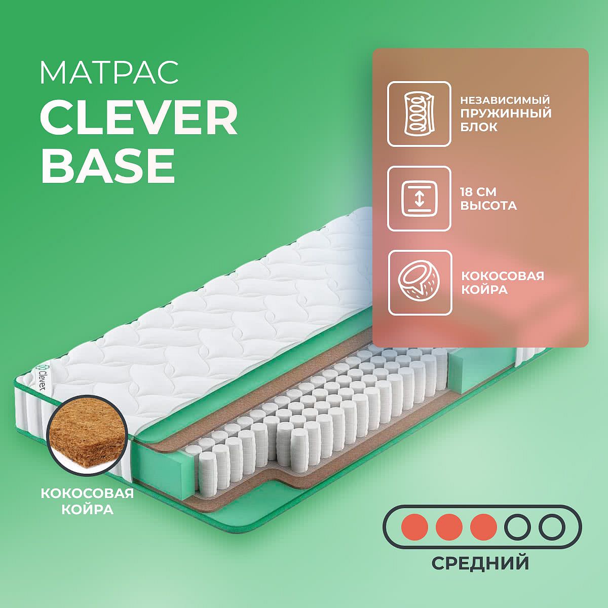 Матрас «Clever Base» — средней жесткости, которая подходит большинству людей среднего телосложения. Это — универсальный выбор и детям, и взрослым, и пожилым людям.