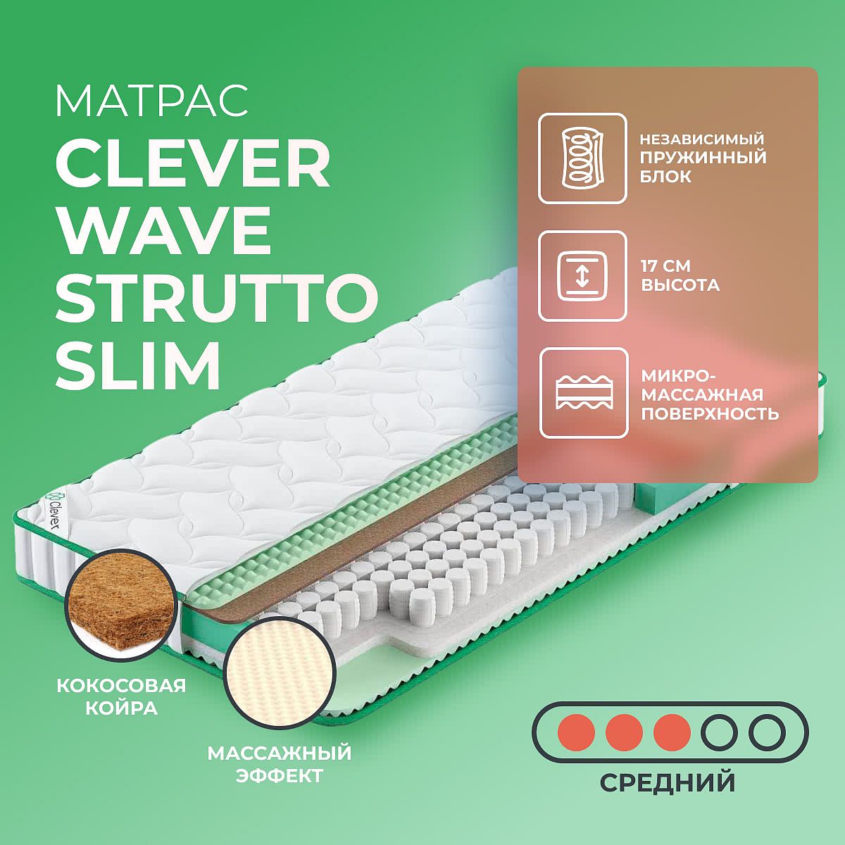 Матрас «Clever Wave Strutto Slim» — средней жесткости, которая комфортна большинству людей среднего телосложения. Это — оптимальный вариант и детям, и взрослым, и пожилым людям.