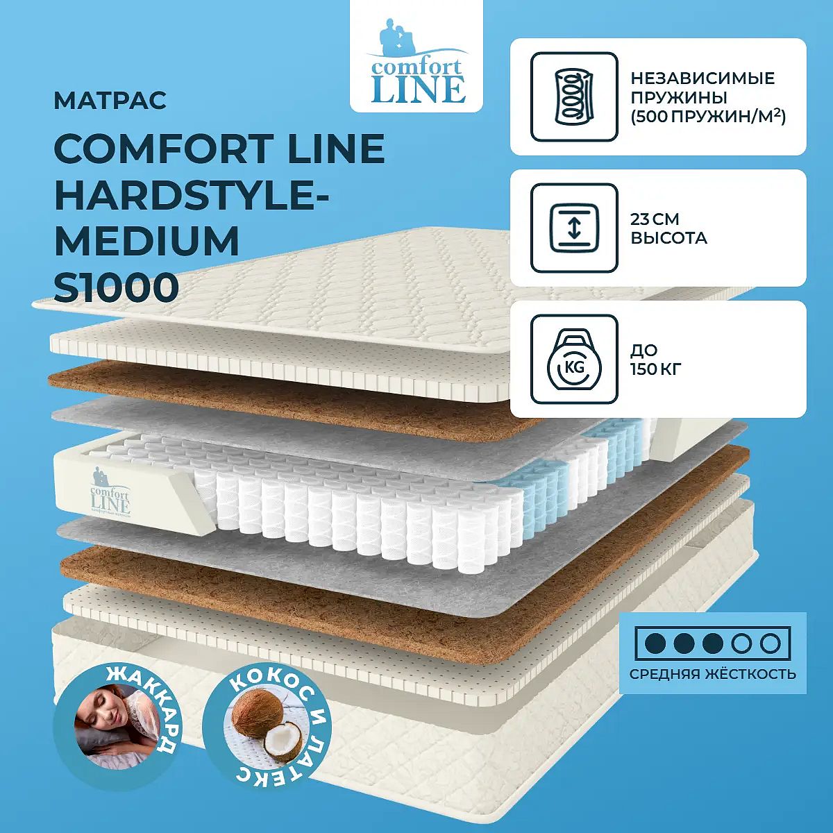 Наполнение моделиОснову этой модели составляет сочетание кокос-латекс. Это премиальные материалы высокого качества, они обладают повышенным уровнем комфорта, создают условия для благоприятного сна. Кокосовая койра обеспечивает ровную и жесткую поверхность, на которой тело может вытянуться и получить надежную поддержку. Жесткие волокна кокоса хорошо пропускают воздух и быстро сохнут. Натуральный латекс «разбавляет» жесткие кокосовые волокна, добавляет мягкости и эластичности, расслабляет тело и снимает мышечное напряжение.Дейcтвие пружин S1000Матрас держится на пружинах независимого типа S1000. Это блок по 500 пружин на 1 кв. метр. Все они действуют самостоятельно, точечно воздействуют на тело спящего. На такой поверхности создается необходимый комфорт, тело расслабляется. Нагрузка распределяется равномерно по всей поверхности. Блок S1000 способен выдерживать большие нагрузки.Жаккардовый чехолЧехол модели изготовлен из плотного хлопкового жаккарда, простеганного на холлконе.Защита матрасаДля того, чтобы обеспечивать защиту вашего спального места от любых загрязнений, влаги и пыли рекомендуем купить дополнительно защитный чехол или водонепроницаемый наматрасник.Другие моделиРекомендуем также посмотреть другие модель на основе кокоса и латекса: Comfort Line Medium Comfort S1000, Comfort Line Hard-HardStyle S1000.