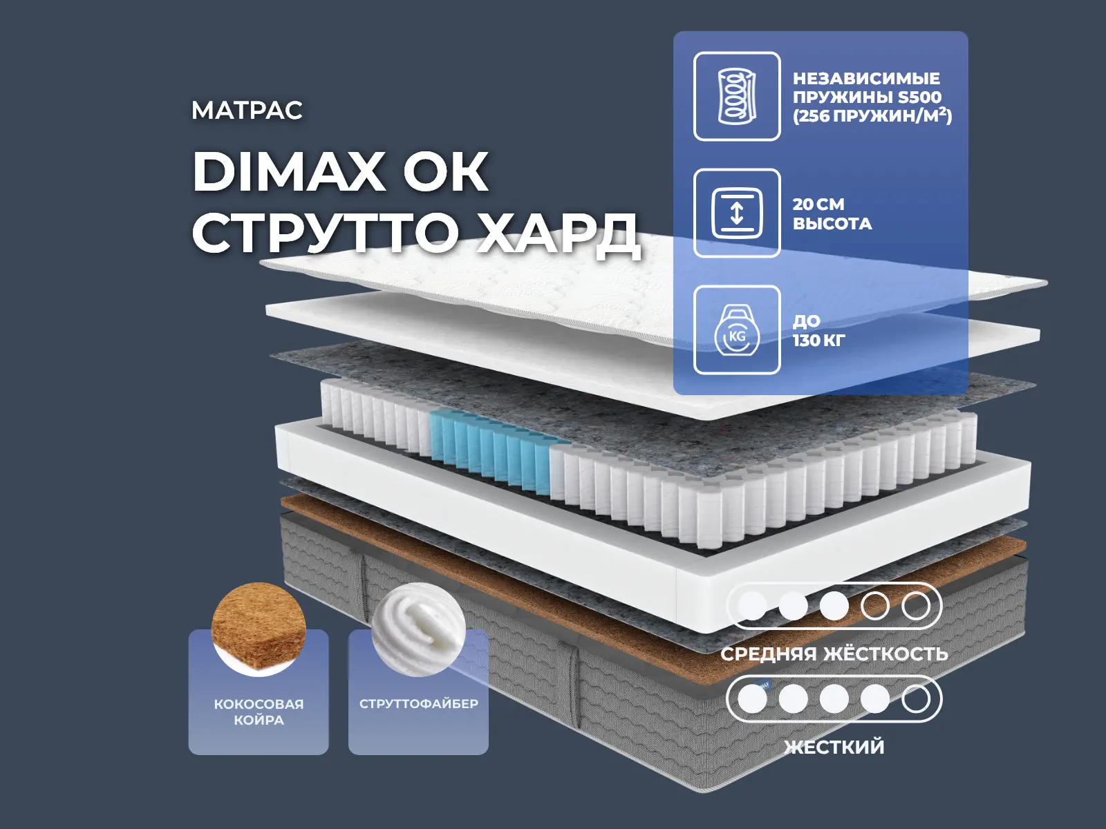 Особенности работы пружин 3 ZoneОсновой модели служит независимый блок, где установлено сразу 512 пружин на спальное место. Именно они отвечают за равномерное распределение нагрузки и точечную физиологически правильную поддержку позвоночника. Независимые пружины гарантируют матрасу отличную поддержку, а в купе со специальными материалами создают уникальное по комфорту спальное место.Пружинный блок 3 Zone состоит из пружин разной жёсткости. Система учитывает анатомию, и усилена более жёсткими пружинами в местах повышенного давлениями. В то же время более мягкие спирали установлены в местах с меньшей нагрузкой. Это даёт более продуманную и сбалансированную поддержку всего тела. По обеим сторонам от блока проложены слои термоизолирующего войлока. Наполнение моделиВ качестве материалов используются с одной стороны натуральная кокосовая койра, а с другой – современный гипоаллергенный струттофайбер. Кокос обеспечивает поддержку всего тела, позволяет ему принимать естественное положение в сне. Кокос хорошо вентилируется и не впитывает влагу. Струттофайбер характеризуется повышенной прочностью и гипоаллергенностью. Материал искусственный, изготовлен из скрученных синтетических волокон, очень упругий и гигиеничный.Трикотажный несъемный чехол 4D OriginalВерх матраса состоит из дополнительного комфортного слоя. Прошивной четырехслойный чехол с лицевой стороны состоит из мягкого трикотажа, внутри расположен объемный синтепон в сочетании с пеной Balance, завершающий фиксирующий слой – прочный спанбонд. Бурлет из прочной мебельной ткани рогожки обеспечивает долгосрочную эксплуатацию. По длинным сторонам матраса расположены ручки, с ними удобно менять постельное белье, переворачивать матрас, а так же они придают эстетичный внешний вид.Защита матрасаДля защиты поверхности от пятен от пролитых жидкостей, грязи и пыли рекомендуем купить дополнительно защитный чехол или водонепроницаемый наматрасник.Другие моделиПосмотрите также другие модели серии OK: Dimax OK Медиум Хард, Dimax OK Струтто.Матрас поставляется в полном размере. Скрутить этот матрас невозможно.