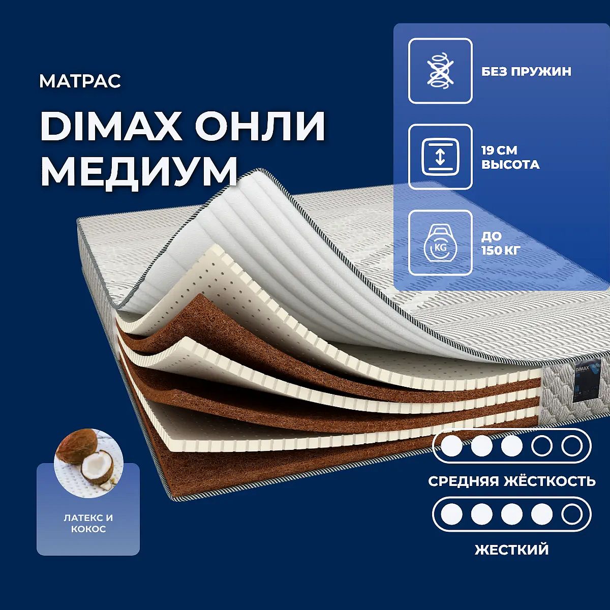 Уровень жесткости: выше среднего/высокий. Две стороны жесткостиМодель имеет две стороны жесткости и основывается на чередовании слоев кокосовой койры и латекса. С одной стороны проложены слои латекса и кокоса , а с другой –кокоса и латекса. Оба материал антиаллергенные и не вызывают аллергию, а также не имеют запаха.Сочетание кокос-латексСторона кокос-латекс – средне-жесткая, то есть имеет универсальную спальную поверхность, которая подойдет абсолютно всем. Латекс смягчает поверхность, делает ее более упругой и мягкой. Он нежно обволакивает тело и позволяет ему расслабиться. Латекс - абсолютно гипоаллергенный и безопасный наполнитель.Сочетание латекс-кокосСторона латекс-кокос имеет повышенную жесткость. Жесткий кокос выравнивает поверхность, делает ее максимально ровной. Кокос создает надежную основу для позвоночника. Позволяет телу спящего принимать естественное положение во время сна. Материал вентилируется и не впитывает влагу.Трикотажный чехолЧехол модели изготавливается из трикотажа с комфортным слоем.Защита матрасаДля защиты поверхности от пятен от пролитых жидкостей, грязи и пыли рекомендуем купить дополнительно защитный чехол или водонепроницаемый наматрасник.Другие моделиПосмотрите также другие модели серии OK: Dimax Онли Медиум Софт, Dimax Онли Медиум Лайт.