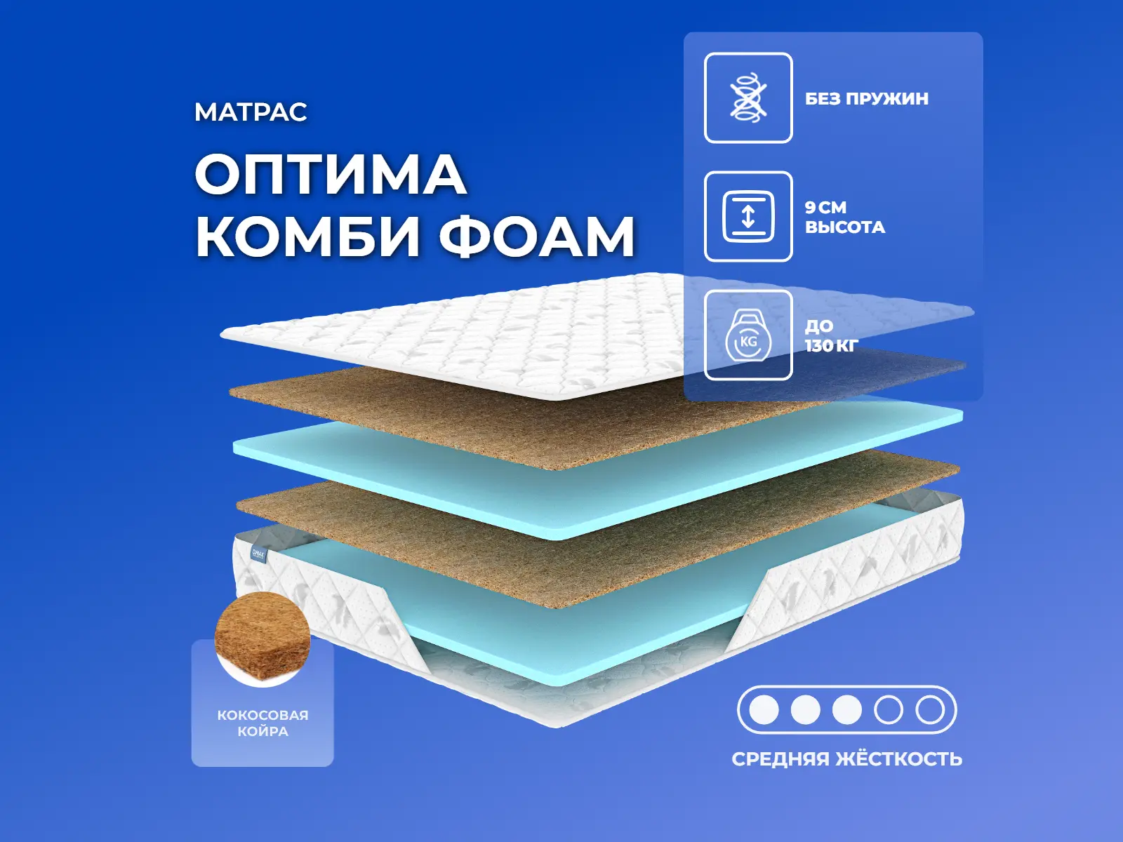 Кокос — натуральный материал, койра отлично дышит, придает матрасу «Оптима Комби Фоам» жесткость и упругость.