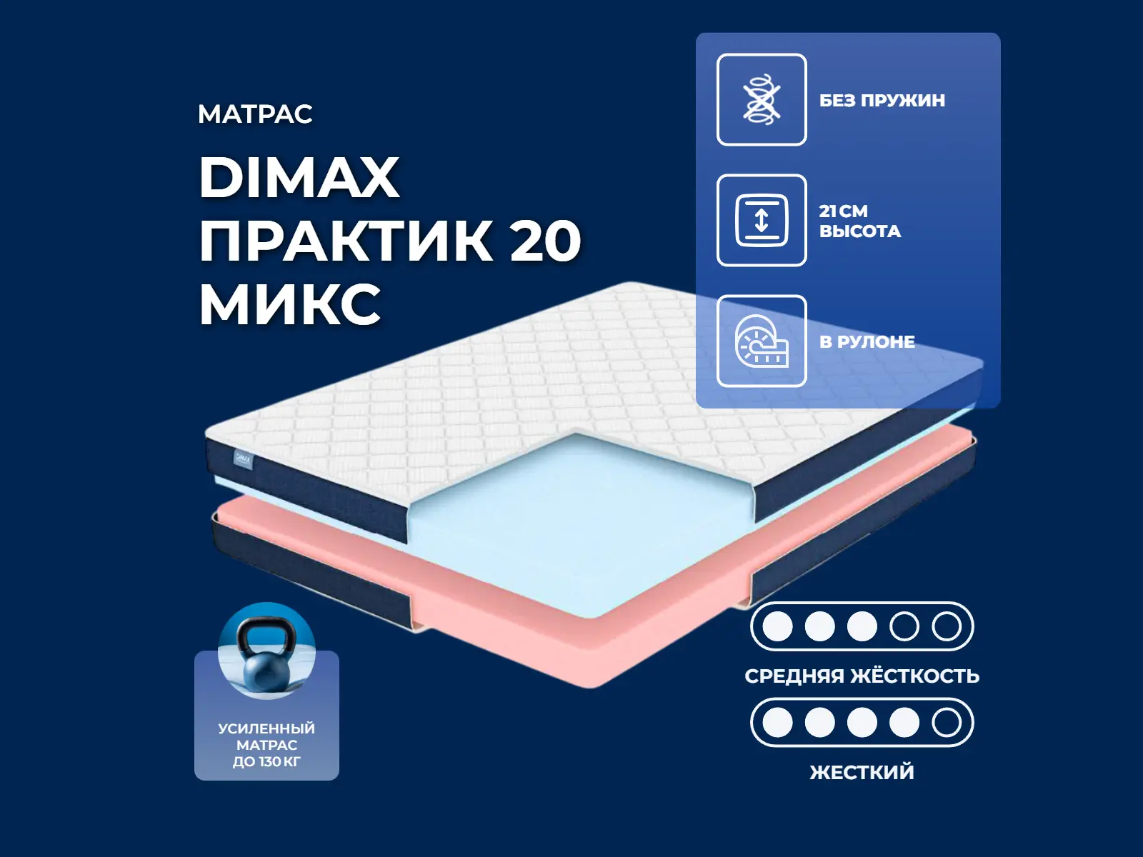Нагрузка на спальное место, кг: 130. Высота, см: 21. Практик 20 микс – отличный беспружинный матрас с практичными и удобными наполнителями. Две спальные стороны позволят выбрать между жесткостью среднего уровня и немного плотнее – выше среднего. Модель построена на качественных и безопасных пенах высокого класса. Наполнение моделиФирменный наполнитель Balance Foam – пена с выдающимися адаптивными качествами. Материал мгновенно подстроится под вашу анатомию и тем самым деликатно снимет нагрузку с суставов и зон напряжения. При этом наполнитель обладает хорошей плотностью, которая не позволит чрезмерно провалиться. Материал даст аккуратную и приятную поддержку.Искусственный латекс представляет собой ещё более плотную пену, чем Balance Foam. Материал имеет очень схожие черты с натуральным латексом. Выраженная эластичность, хорошая упругость, комфортная мягкость – всё это вы найдёте и в данном наполнителе. Пены обеспечат не только комфортное положение тела, но и позаботятся о правильной поддержке спины. ЧехолНа матрас надет фирменный чехол, выполненный из хлопкового жаккарда. Ткань не боится частых нагрузок и хорошо переносит активную эксплуатацию. Бурлет матраса выполнен из мебельной ткани глубокого синего оттенка.Скрутка в рулонПо умолчанию матрас поставляется в скрученном виде (в рулоне).Хранение матрасов в скрутке должно осуществляться: