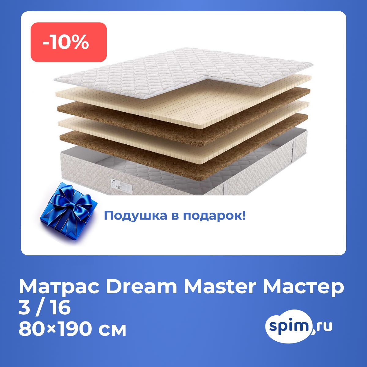 Односпальный матраc Dream Master Мастер 3 / 16 80х190 подойдет для кроватей с размерами спального места, обозначенными как 80x190 см, 800х1900 мм, 190х80 см, 1900х800 мм (ширина 80 см, длина 190 см).