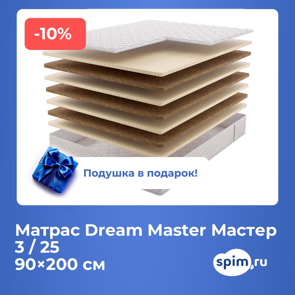 Односпальный матраc Dream Master Мастер 3 / 25 90х200 подойдет для кроватей с размерами спального места, обозначенными как 90x200 см, 900х2000 мм, 200х90 см, 2000х900 мм (ширина 90 см, длина 200 см).