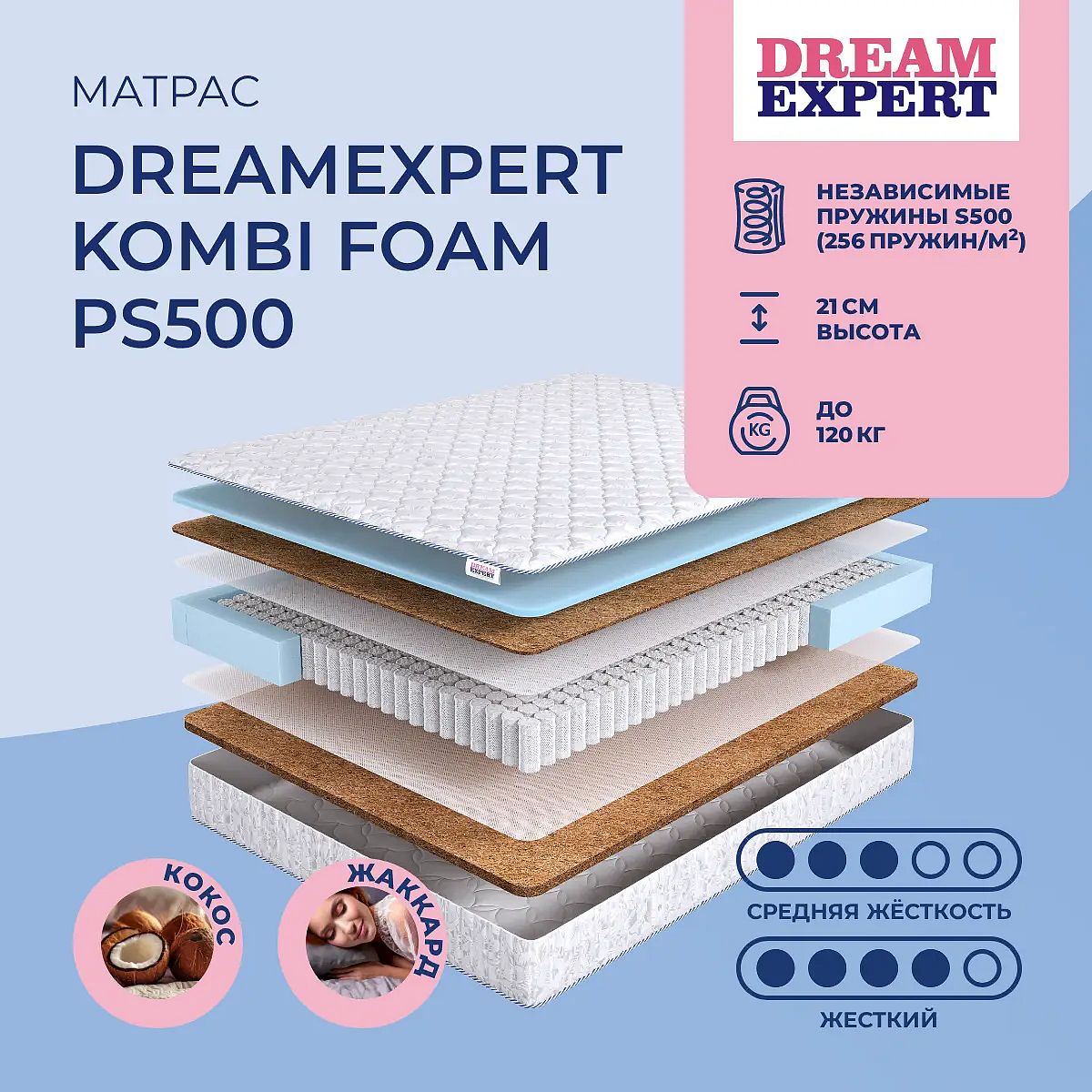 Полутораспальный матрас DreamExpert Kombi Foam PS500 120х200 подойдет для кроватей с размерами спального места, обозначенными как 120x200 см, 1200х2000 мм, 200х120 см, 2000х1200 мм (ширина 120 см, длина 200 см).