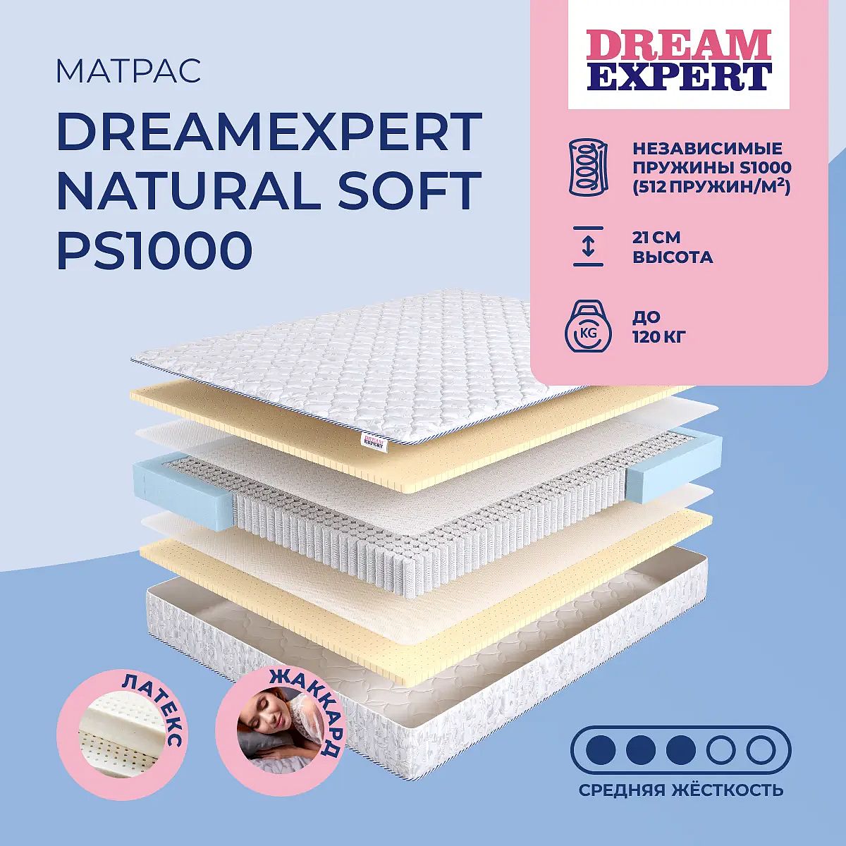Матрас «DreamExpert Natural Soft PS1000» — средней жесткости, которая комфортна большинству людей среднего телосложения. Это — универсальный вариант и детям, и взрослым, и пожилым людям.