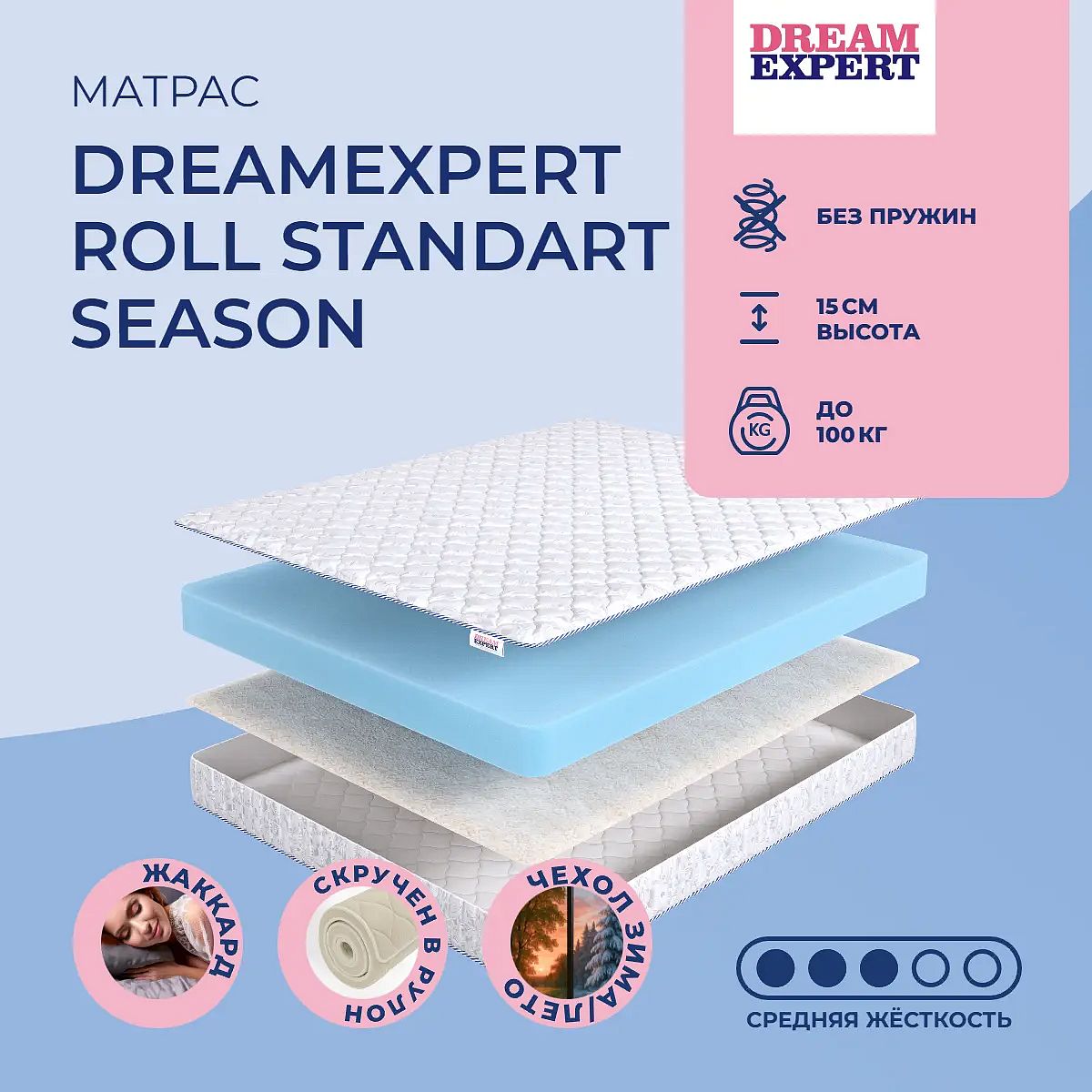 Матрас «DreamExpert Roll Standart Season» — средней жесткости, которая подходит большинству людей среднего телосложения. Это — оптимальный выбор и детям, и взрослым, и пожилым людям.