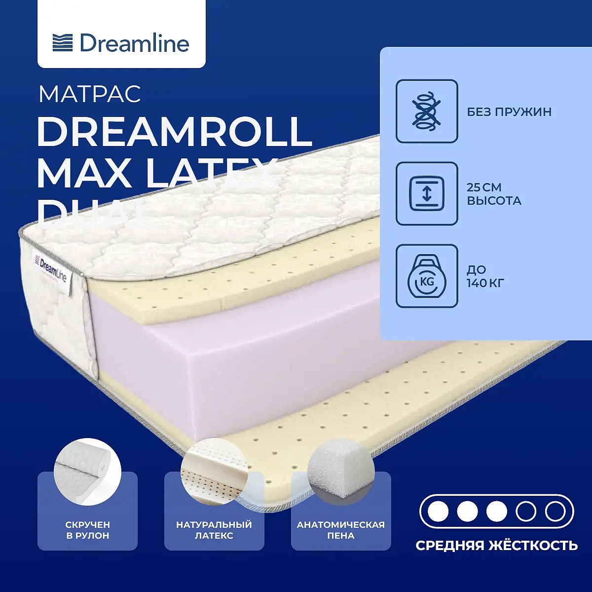 Матрас «DreamLine DreamRoll Max Latex Dual» — средней жесткости, которая подходит большинству людей среднего телосложения. Это — оптимальный выбор и детям, и взрослым, и пожилым людям.