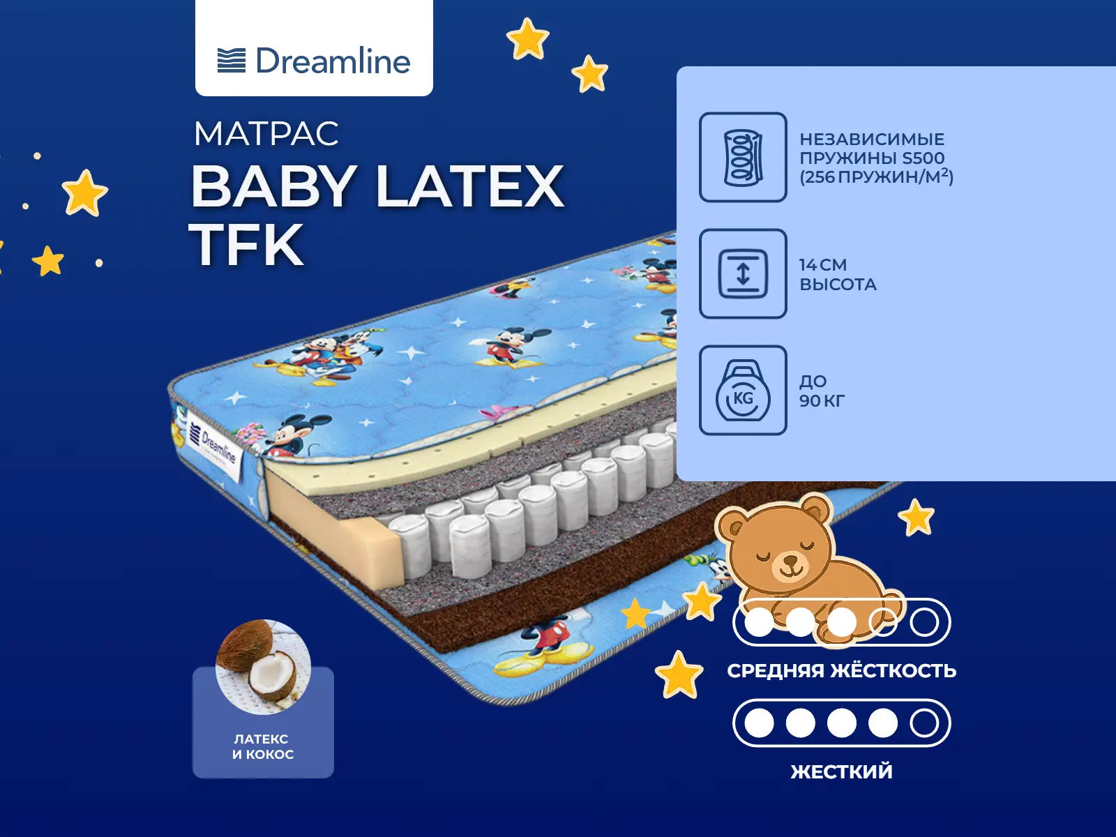 Нагрузка, кг: 90. Высота: 14 см. *Расцветка чехла матраса может отличаться от представленной на фото и зависит от наличия ткани у производителя. Особенности работы пружин TFKМодель базируется на основе независимого блока пружин TFK. В таком блоке по 256 микропружин расположены на 1 кв. метре. Каждая пружина отделена от соседней и помещена отдельный чехол из износостойкого материала. Пружины работают автономно и поэтому точечно воздействуют на тело спящего. Когда ребенок присаживается на такой блок, то прогибается не вся конструкция, а только то место, куда направлена нагрузка. Это позволяет равномерно распределяет нагрузку и создает определенный комфорт на поверхности.Наполнение моделиС одной стороны проложен слой натурального латекса. Латекс - это природный материал, очень упругий и эластичный, он делает поверхность невероятно мягкий и комфортный, способствует расслаблению тела и снятию напряжения. С другой стороны слой кокосовой койры. Это также природный материал, только очень жесткий. Кокос создает надежную основу и поддерживает позвоночник в правильном положении, способствует образованию естественных поз во время сна. Кокос хорошо вентилируется и не имеет запаха. Латекс и кокос являются гипоаллергенными материалами, не вызывающими аллергических реакций.Гипоаллергенный чехолЧехол модели представляет собой бязь, простеганную на гипоаллергенном холлконе. Чехол имеет рисунок.Защита матрасаДля защиты от загрязнений, нежелательных пятен рекомендуем купить защитный наматрасник или водонепроницаемый чехол. Он сохранит поверхность чистой, а также продлит срок службы матраса.Другие моделиТакже вы можете посмотреть другие детские модели с кокосом на пружинах TFK: Dreamline Baby Dream TFK, Dreamline Baby Sleep Dream TFK.
