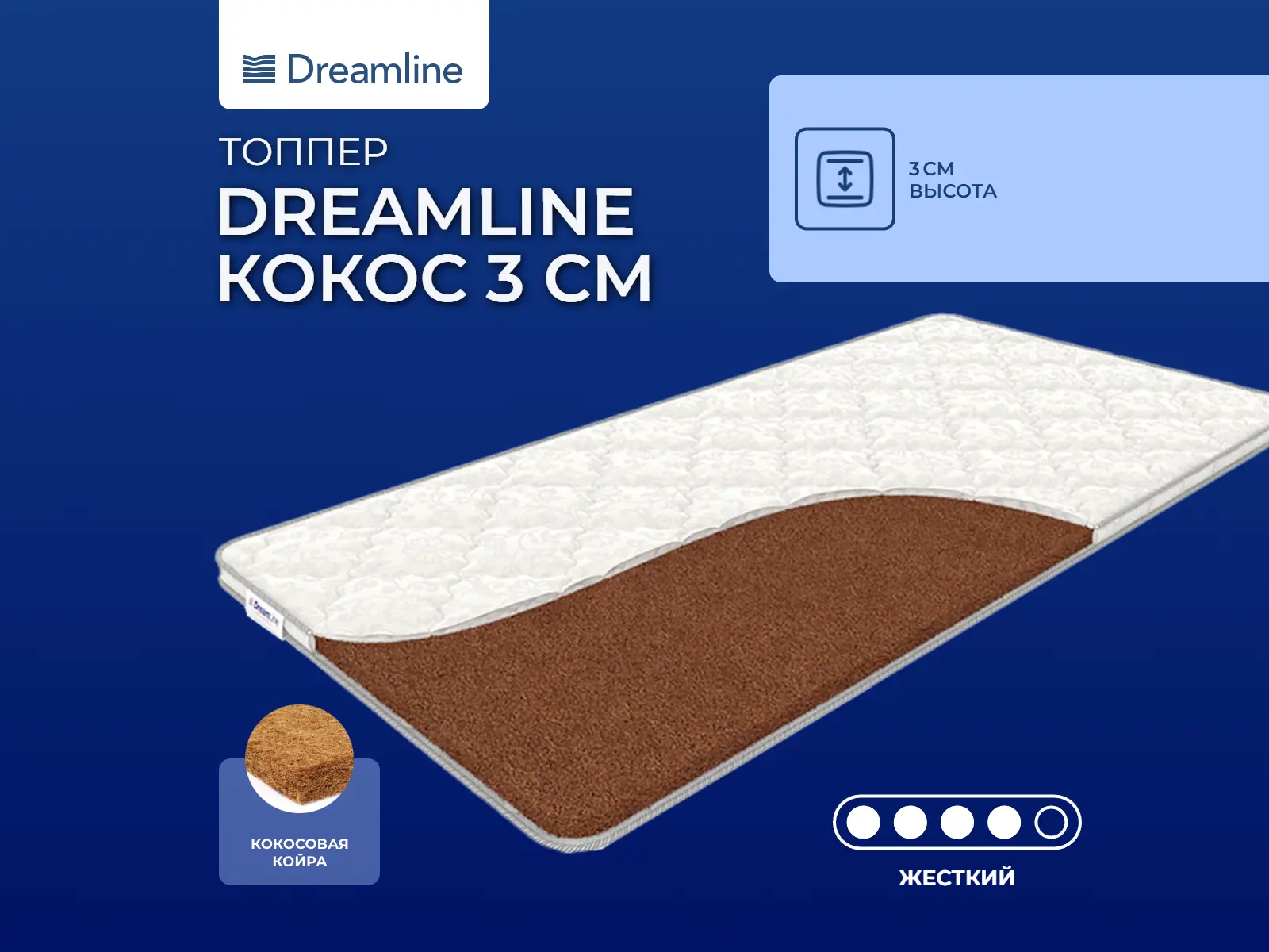 Матрас высокой жесткости «DreamLine Кокос 3 см» — оптимальный выбор для уверенной поддержки позвоночника. Именно такие модели обычно рекомендуют подросткам, спортсменам или людям с проблемами позвоночника.