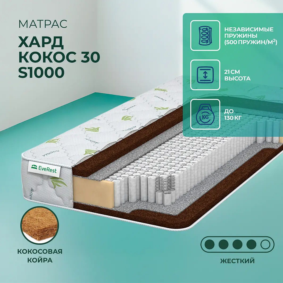 Матрас высокой жесткости «EveRest Хард Кокос 30 S1000» — оптимальный выбор для уверенной поддержки позвоночника. Именно такие модели обычно рекомендуют подросткам, спортсменам или людям с проблемами позвоночника.