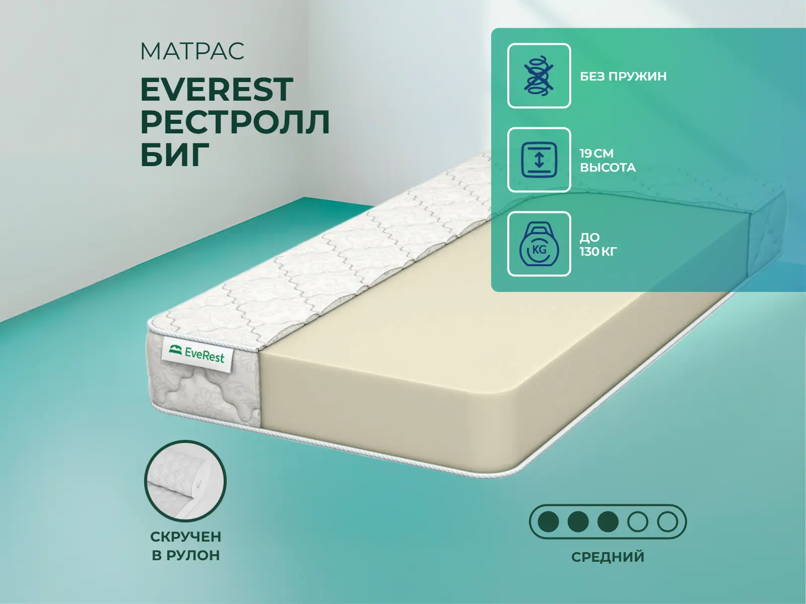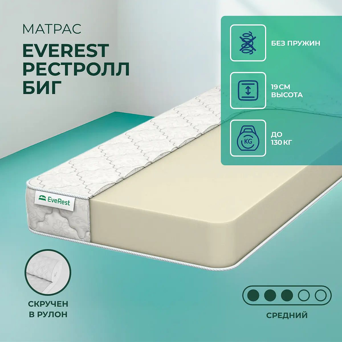 Матрас «EveRest Рестролл Биг» — средней жесткости, которая подходит большинству людей среднего телосложения. Это — универсальный выбор и детям, и взрослым, и пожилым людям.
