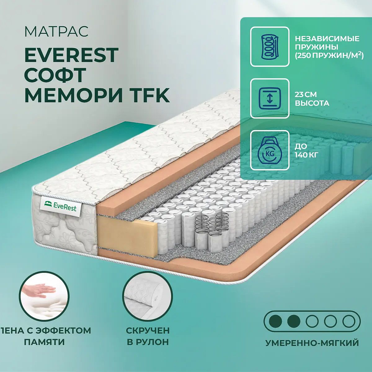 Средне-мягкий матрас «EveRest Софт мемори TFK» — для истинного ценителя комфорта. Такой вариант хорошо подходит людям с небольшим весом.