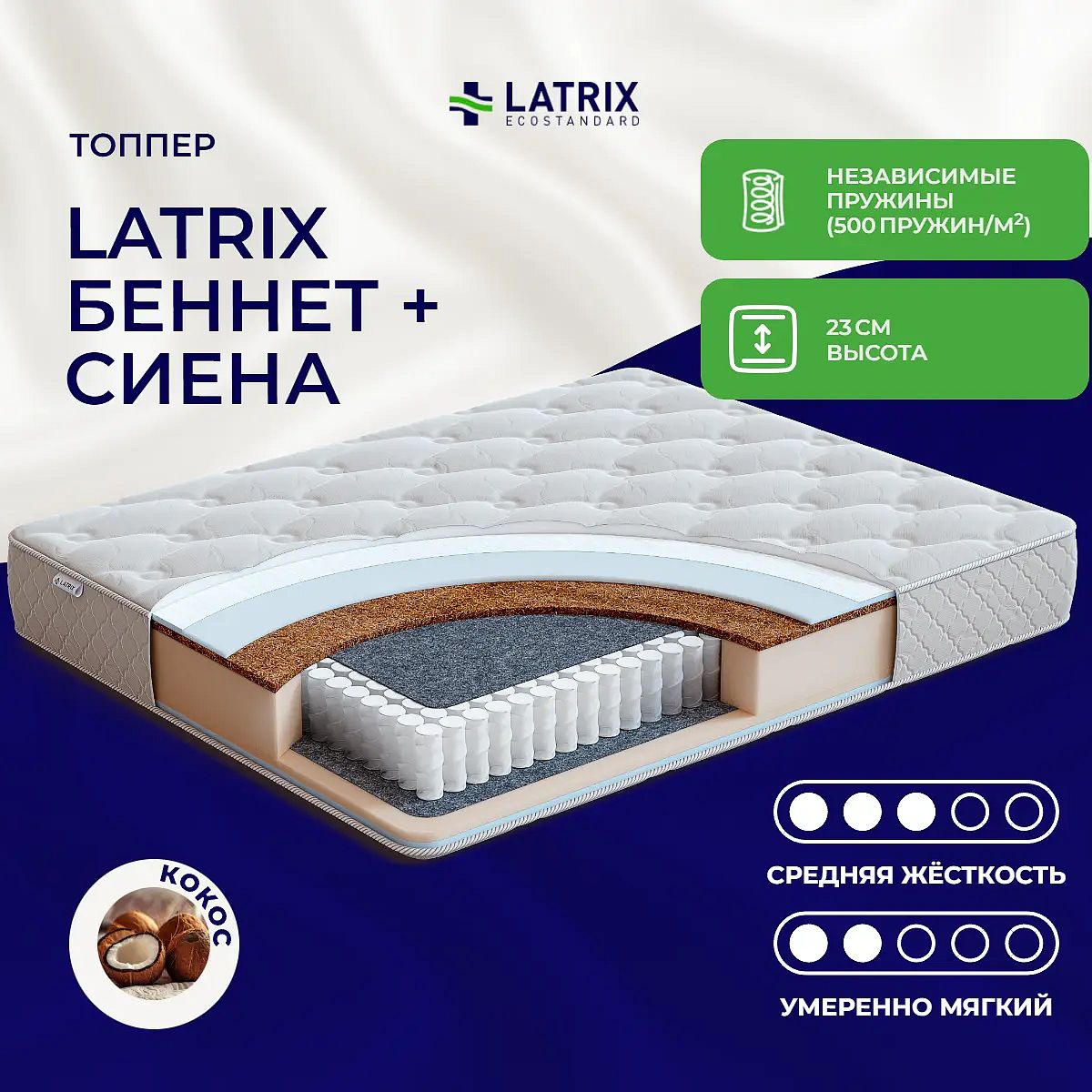 Кокос — натуральный материал, койра отлично дышит, придает матрасу «Беннет + Сиена» жесткость и упругость.