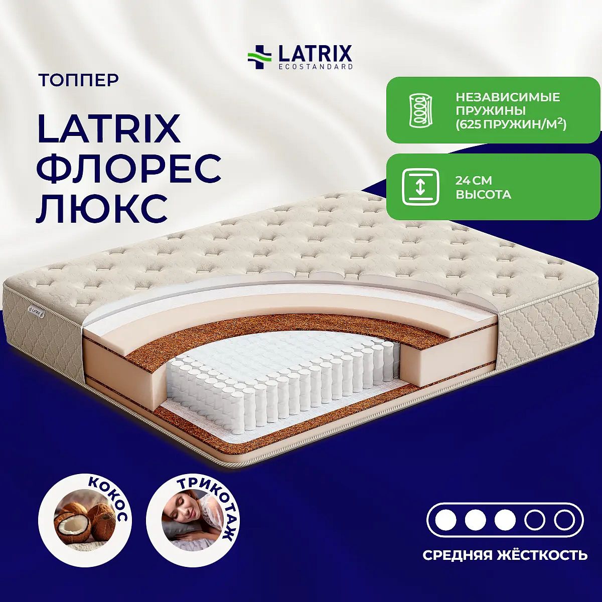 Матрас «Latrix Флорес Люкс» — средней жесткости, которая комфортна большинству людей среднего телосложения. Это — универсальный вариант и детям, и взрослым, и пожилым людям.