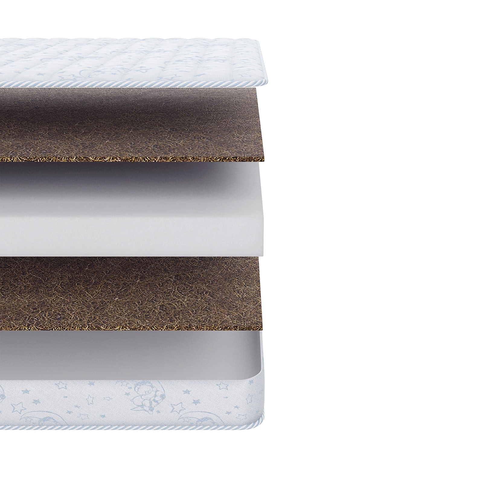 Беспружинный матрас. Обеспечивает физиологически правильное положение тела. Рекомендуемая нагрузка до 50 кг. Латексированная кокосовая койра (1 см). Терморегулируемый холлофайбер (8 см). Латексированная кокосовая койра (1 см). Холлофайбер и кокос обладают такими важнейшими для здоровья ребенка свойствами как антистатичность, антиаллергенность и антибактериальность. Чехол хлопковый. Высота - 10 см.