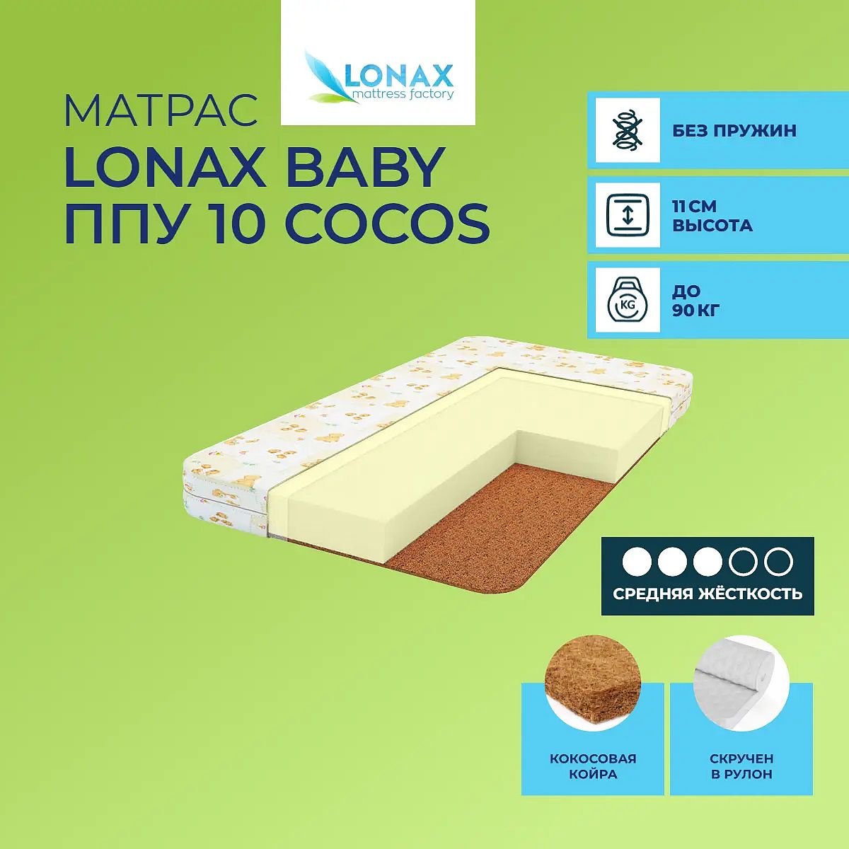 Матрас «Lonax Baby ППУ 10 Cocos (Поликоттон)» — средней жесткости, которая комфортна большинству людей среднего телосложения. Это — оптимальный вариант и детям, и взрослым, и пожилым людям.