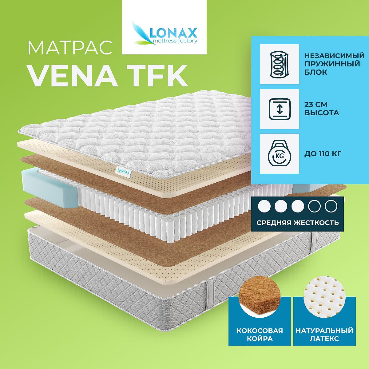 Высота: 23 см. Максимальная нагрузка на одно спальное место: 110 кг. По умолчанию матрас поставляется в развернутом виде. По Вашему желанию матрас может быть скручен в рулон. Максимальный размер матраса, доступный для скрутки – 200х200. Матрас Vena TFK – матрас средней жесткости, для тех кто предпочитает натуральные материалы. Основа матраса: независимый пружинный блок TFK (256 пружин/м2) – идеальный баланс высокого уровня анатомичности и демократичной цены. Натуральный латекс высотой 3 см, усиленный кокосовой койрой высотой 1 см, формирует эргономичное спальное место оптимальной жесткости. Оба наполнителя прекрасно пропускают воздух и не накапливают влагу, оставляя Ваш матрас гигиеничным в течение всего срока службы. Трикотажный чехол формирует приятный для сна микроклимат, отводя избыточную влагу и тепло.