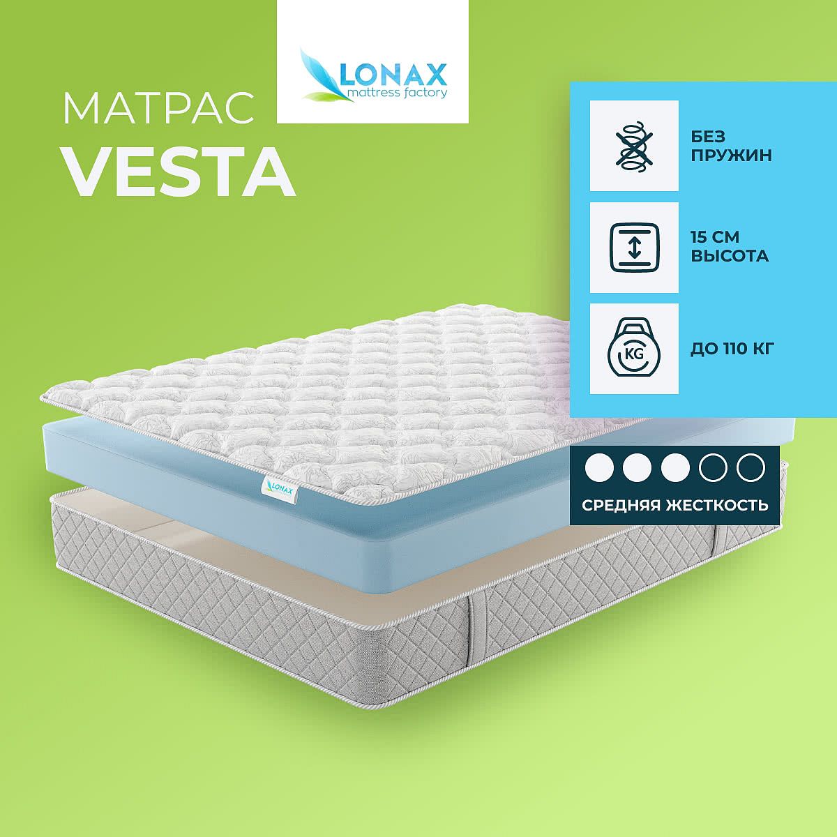 Матрас «Lonax Vesta» — средней жесткости, которая комфортна большинству людей среднего телосложения. Это — универсальный вариант и детям, и взрослым, и пожилым людям.