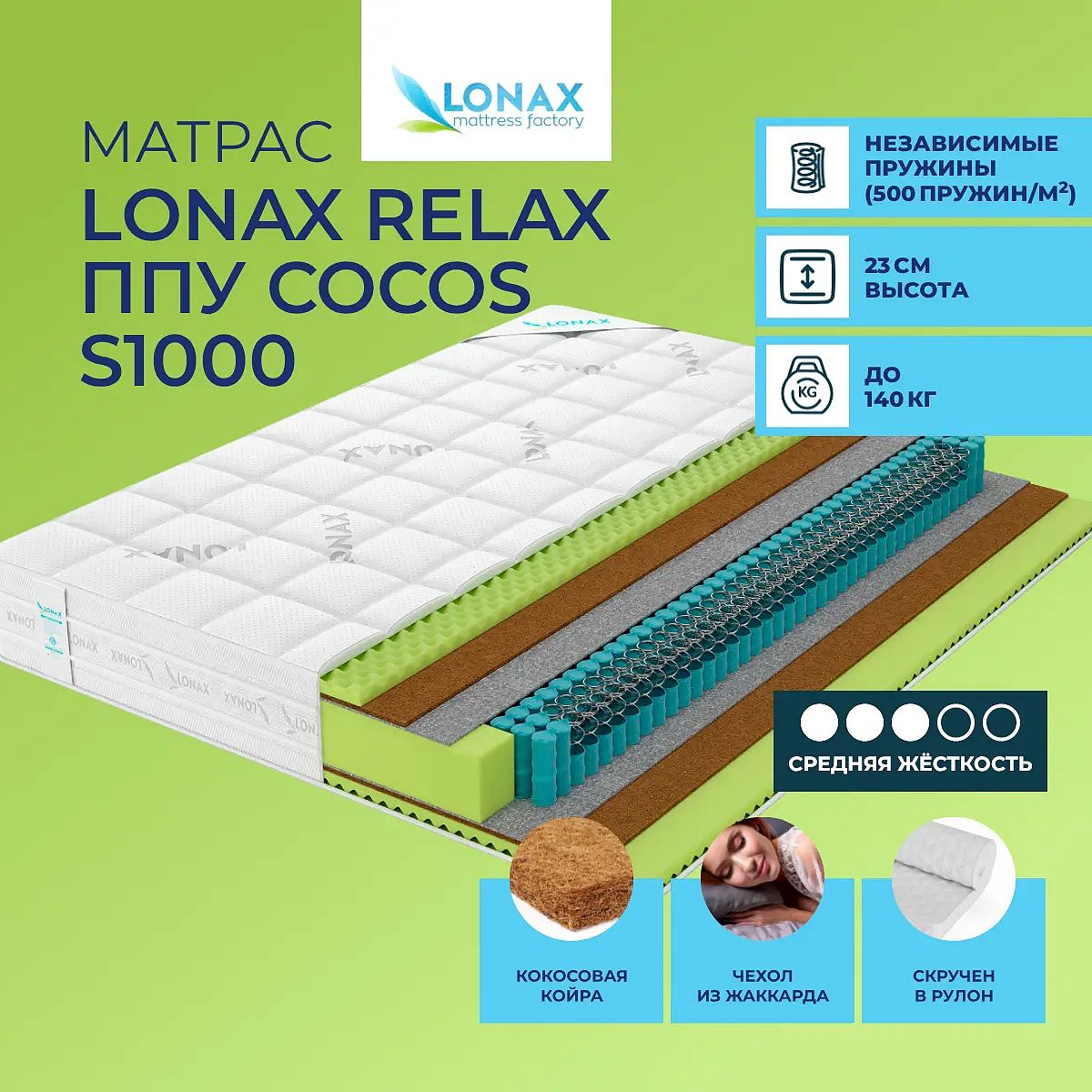 Матрас «Lonax Relax ППУ Cocos S1000» — средней жесткости, которая комфортна большинству людей среднего телосложения. Это — универсальный вариант и детям, и взрослым, и пожилым людям.