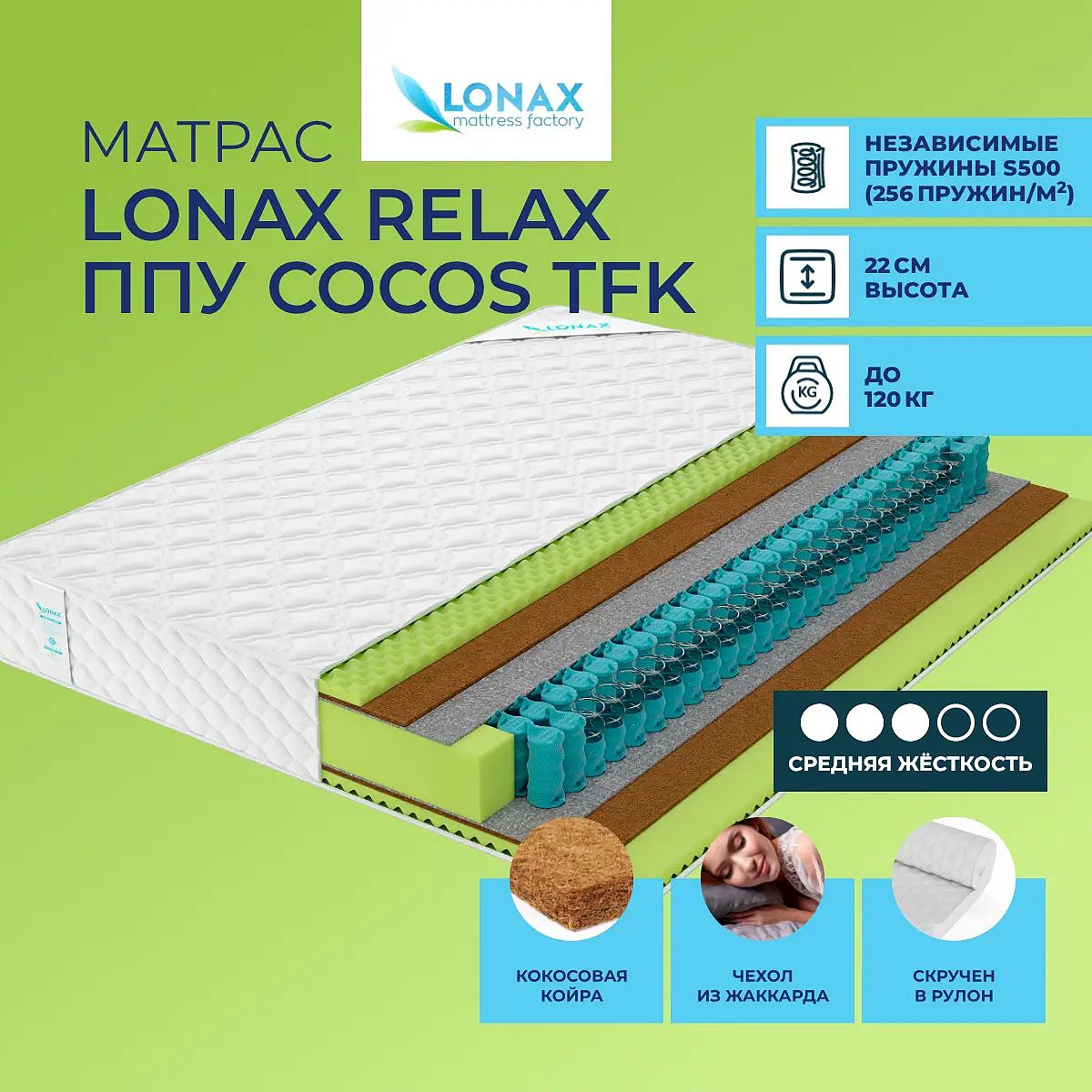 Матрас «Lonax Relax ППУ Cocos TFK» — средней жесткости, которая подходит большинству людей среднего телосложения. Это — универсальный вариант и детям, и взрослым, и пожилым людям.