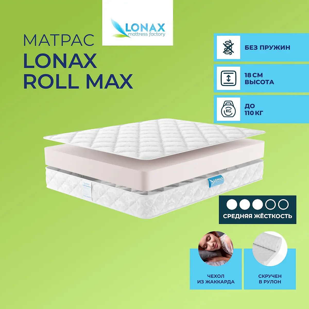 Матрас «Lonax Roll Max» — средней жесткости, которая подходит большинству людей среднего телосложения. Это — универсальный выбор и детям, и взрослым, и пожилым людям.