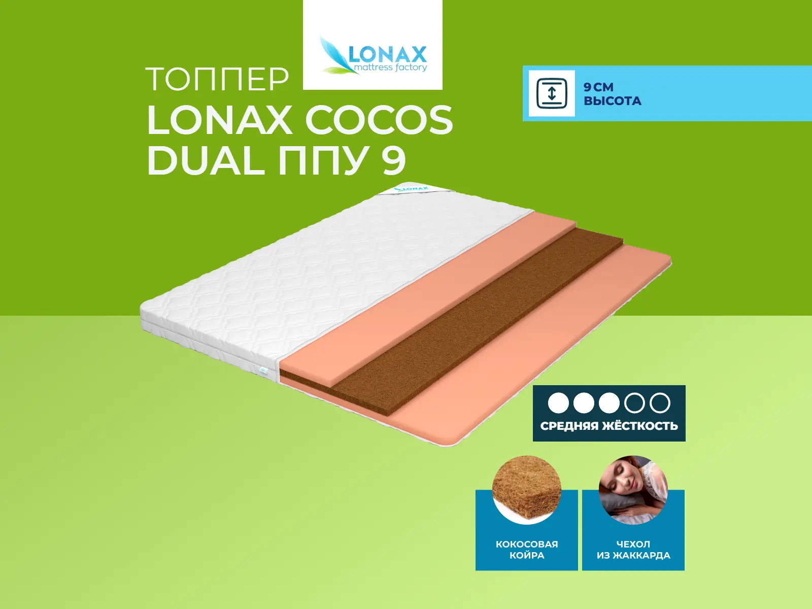 Матрас «Lonax Cocos Dual ППУ 9» — средней жесткости, которая комфортна большинству людей среднего телосложения. Это — универсальный выбор и детям, и взрослым, и пожилым людям.