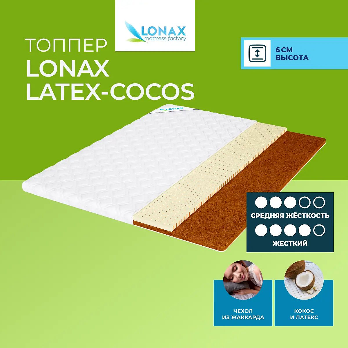 Уровень жесткости: средний/высокий.Состав: натуральный латекс – 3 см, кокосовая койра – 3 см. Съемный чехол: хлопковый жаккард, простеганный на синтепоне. Крепление: резинки или липучки (на выбор). Высота, см: 6. Фактический внешний вид изделия (оттенок цвета ткани, рисунок стёжки и т.п.) может отличаться от изображения, представленного на сайте.