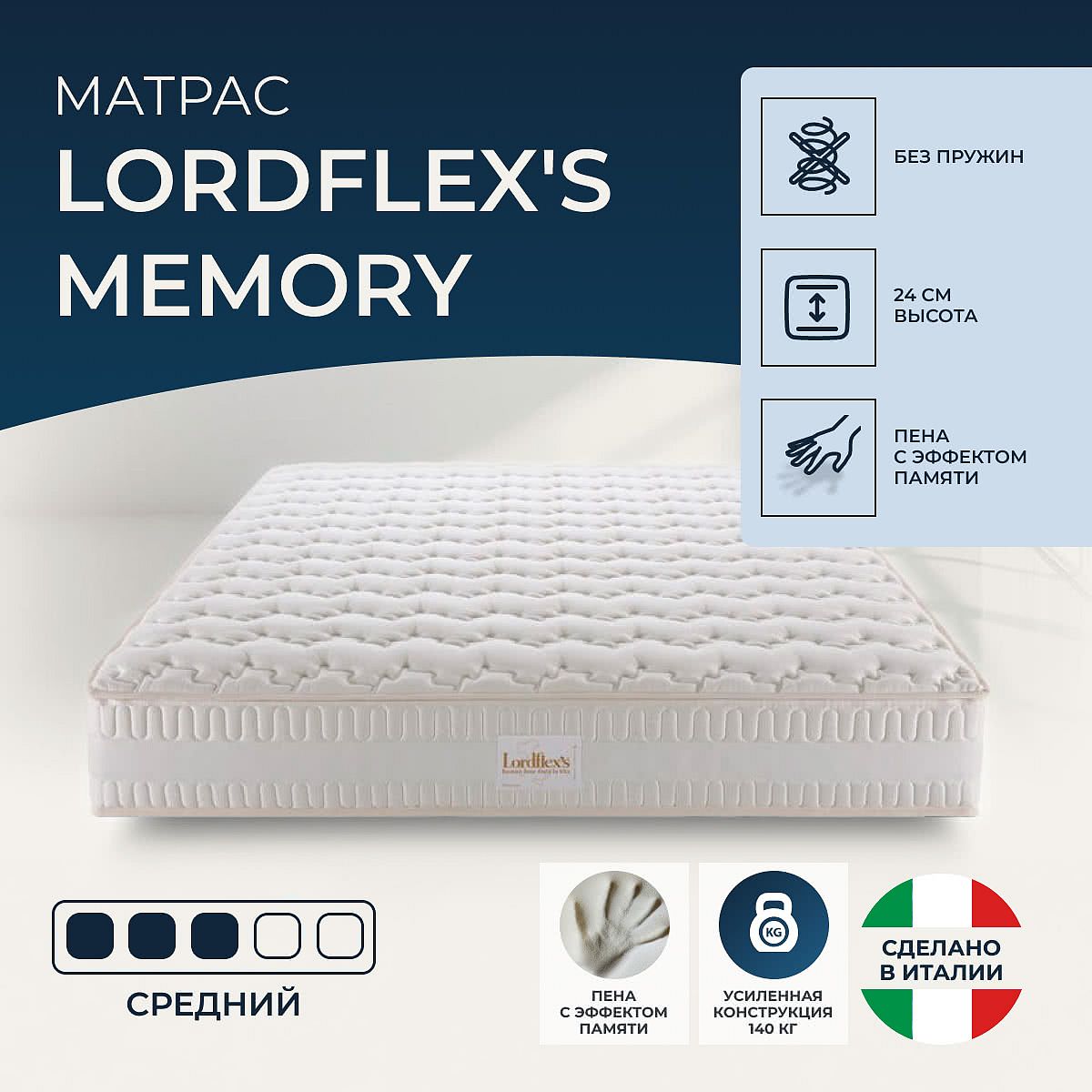 Матрас «Lordflex's Memory» — средней жесткости, которая подходит большинству людей среднего телосложения. Это — оптимальный выбор и детям, и взрослым, и пожилым людям.