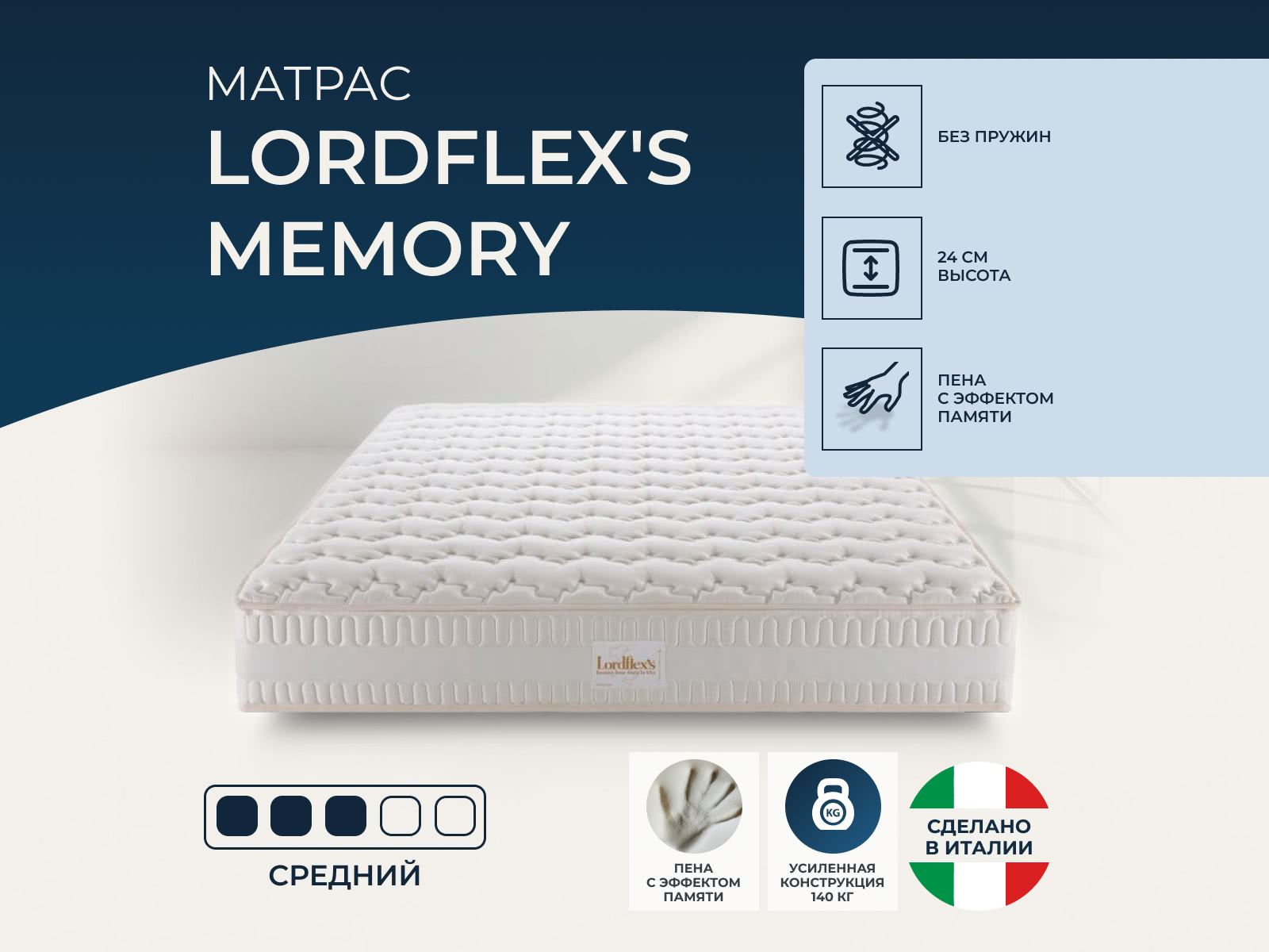Матрас «Lordflex's Memory» — средней жесткости, которая подходит большинству людей среднего телосложения. Это — оптимальный выбор и детям, и взрослым, и пожилым людям.