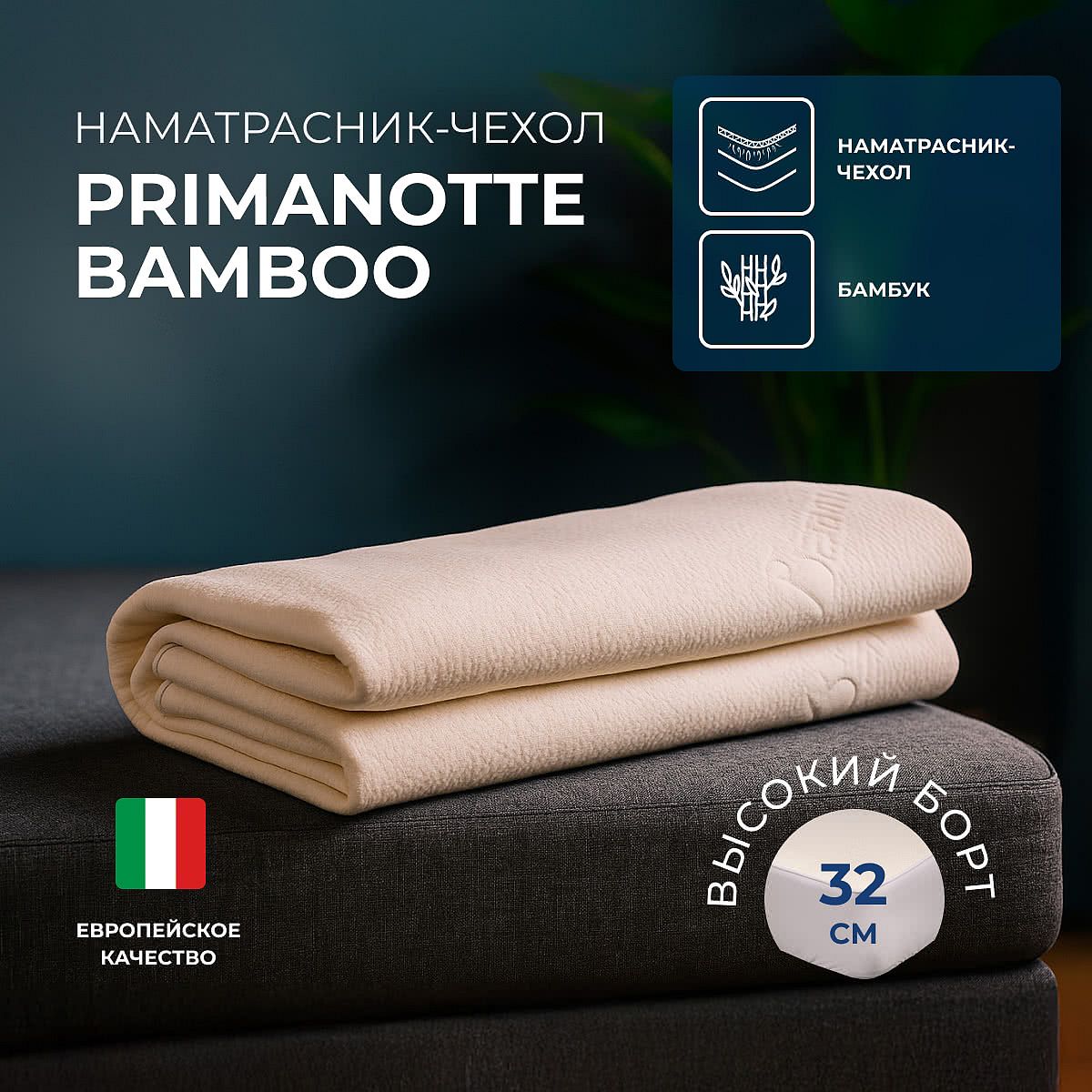 Верхняя поверхность защитного чехла Bamboo выполнена из бамбуковой ткани – это современный экологичный материал, который производится из переработанных волокон бамбука. Эта ткань сочетает в себе натуральные свойства и современные технологии производства, что делает ее популярной в текстильной индустрии. Бамбуковая ткань отличается мягкостью, гипоаллергенностью, воздухопроницаемостью и высокой гигроскопичностью. Чехол имеет высокий бортик на резинке высотой 32 см, а следовательно подходит для матрасов высотой до 30 см. Сам бортик закрывает матрас по периметру, в том числе и по торцам матраса. Бортик чехла выполнен из материала rayon. Ткань район — это искусственный текстильный материал, изготовленный из регенерированной целлюлозы. Этот материал имитирует свойства натурального шелка, благодаря чему обладает мягкостью, гладкостью и хорошей драпируемостью. Защитный чехол PrimaNotte Bamboo защищает матрас от загрязнений по всему периметру, в том числе и по торцам, а также защищает его от преждевременного изнашивания, что существенно увеличивает полезный срок службы матраса. Уход за чехлом: деликатная стирка до 40 градусов, горизонтальная сушка (при вертикальной сушке ткань bamboo может растянуться), не гладить и не отбеливать, не использовать сушку. Чехол поставляется в прочной прозрачной сумке с ручками и фирменной картонной коробке.