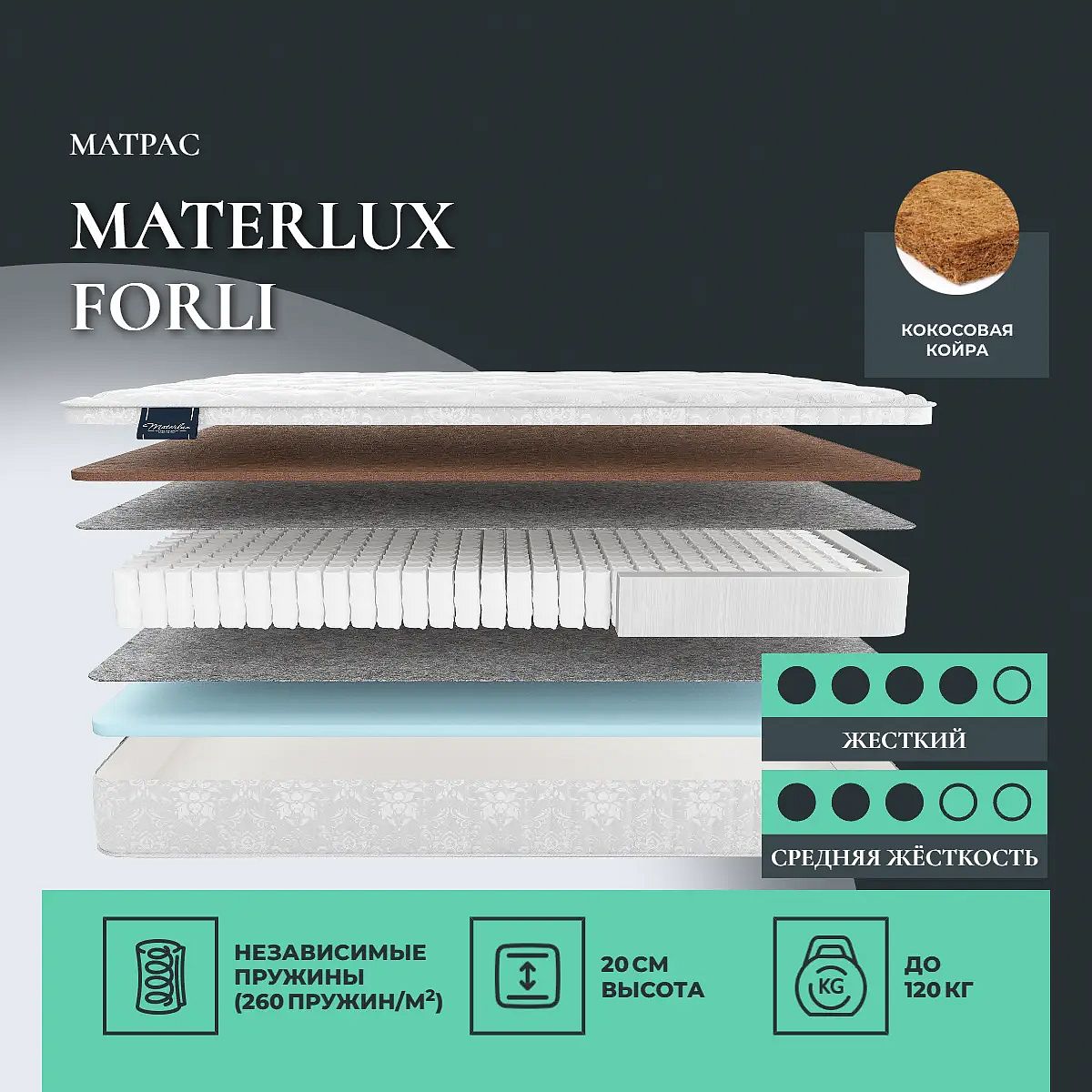 Кокос — натуральный материал, койра отлично дышит, придает матрасу «Forli» жесткость и упругость.