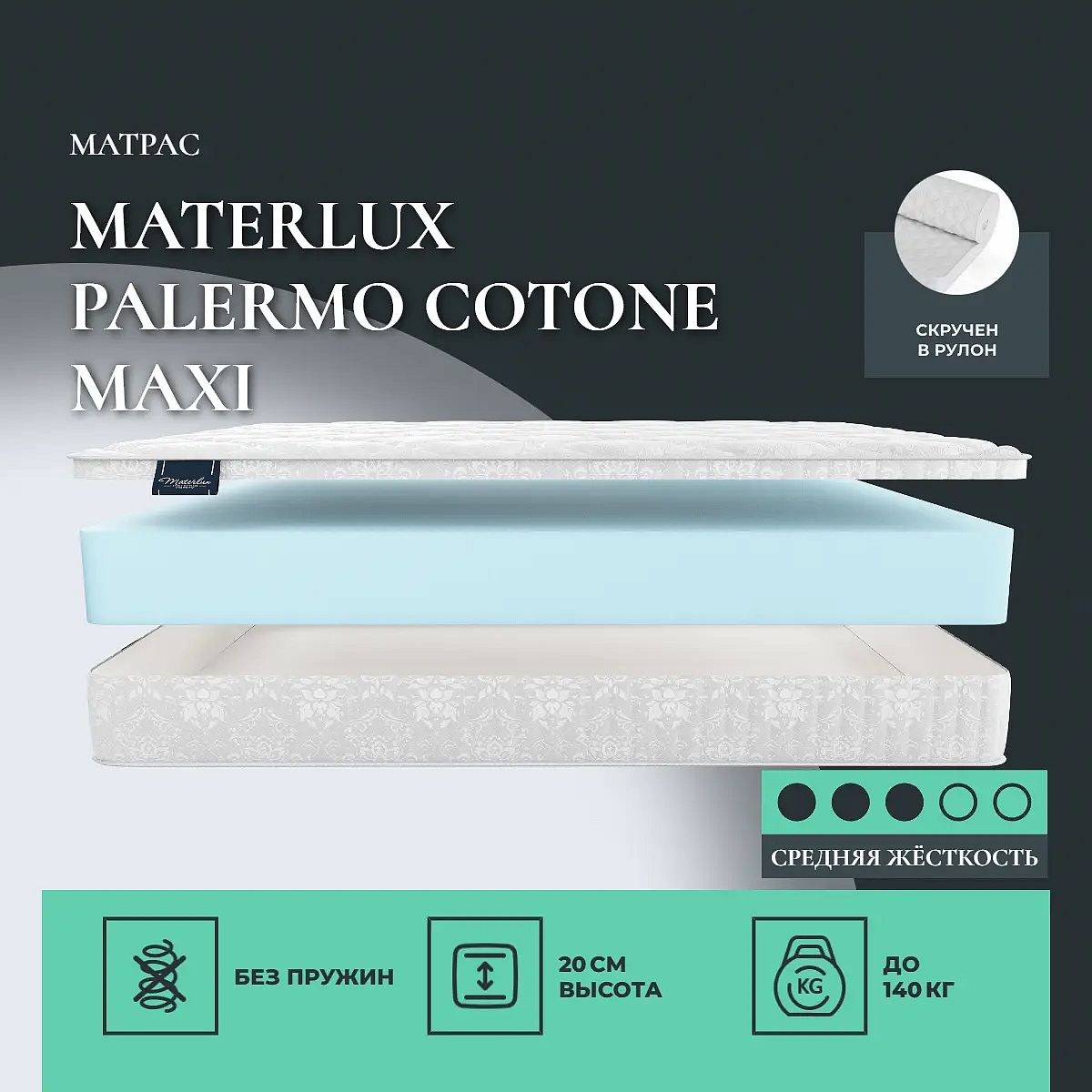 Матрас «Materlux Palermo Cotone Maxi» — средней жесткости, которая подходит большинству людей среднего телосложения. Это — универсальный вариант и детям, и взрослым, и пожилым людям.