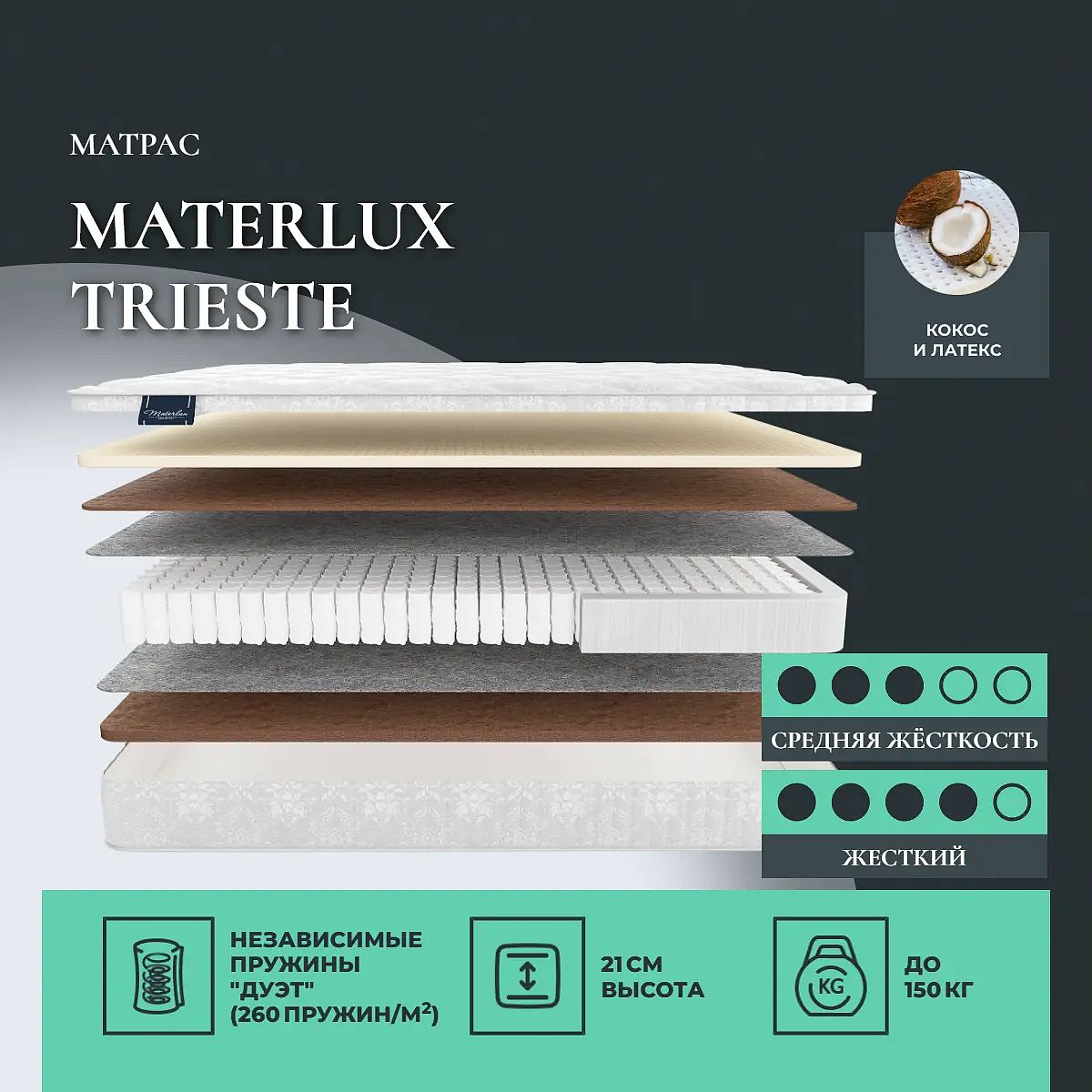 Кокос — натуральный материал, койра отлично дышит, придает матрасу «Trieste» жесткость и упругость.