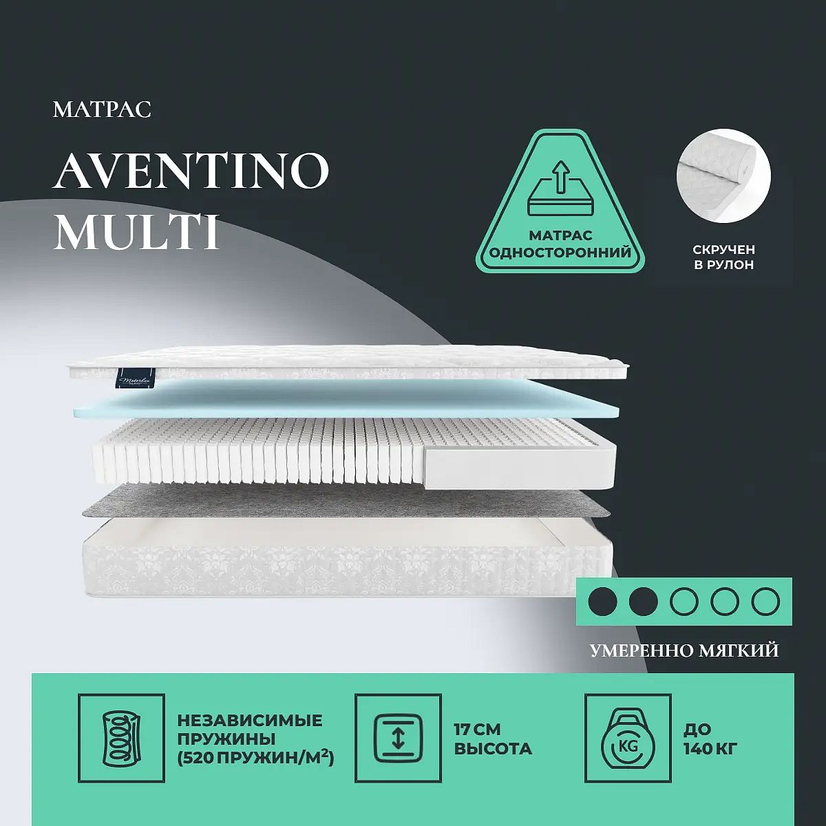 Средне-мягкий матрас «Materlux Aventino Multi» просто создан для истинного ценителя комфорта. Такой вариант отлично подходит людям с небольшим весом.