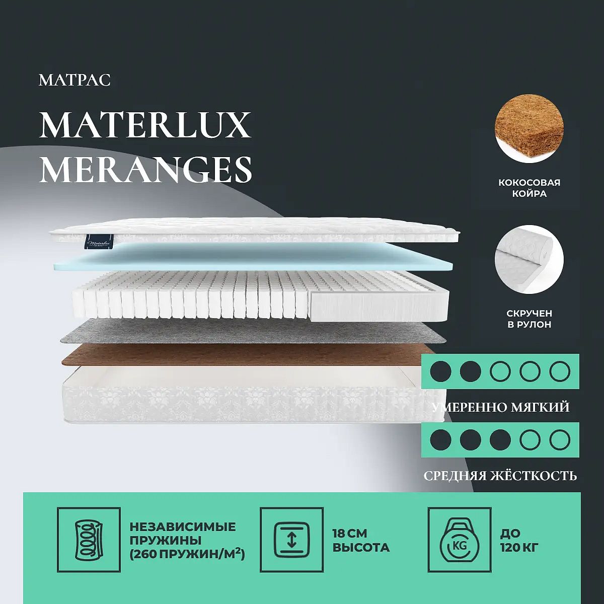 Полутораспальный матрас Materlux Meranges 120х200 подойдет для кроватей с размерами спального места, обозначенными как 120x200 см, 1200х2000 мм, 200х120 см, 2000х1200 мм (ширина 120 см, длина 200 см).