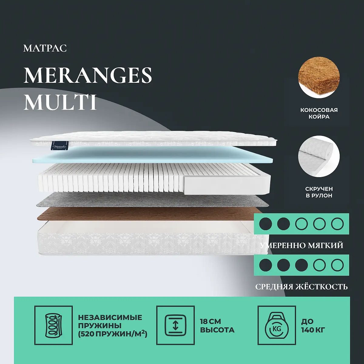 Преимущество матраса Meranges Multi — он имеет 2 различные по жесткости стороны: средне-мягкую и средне-жесткую.