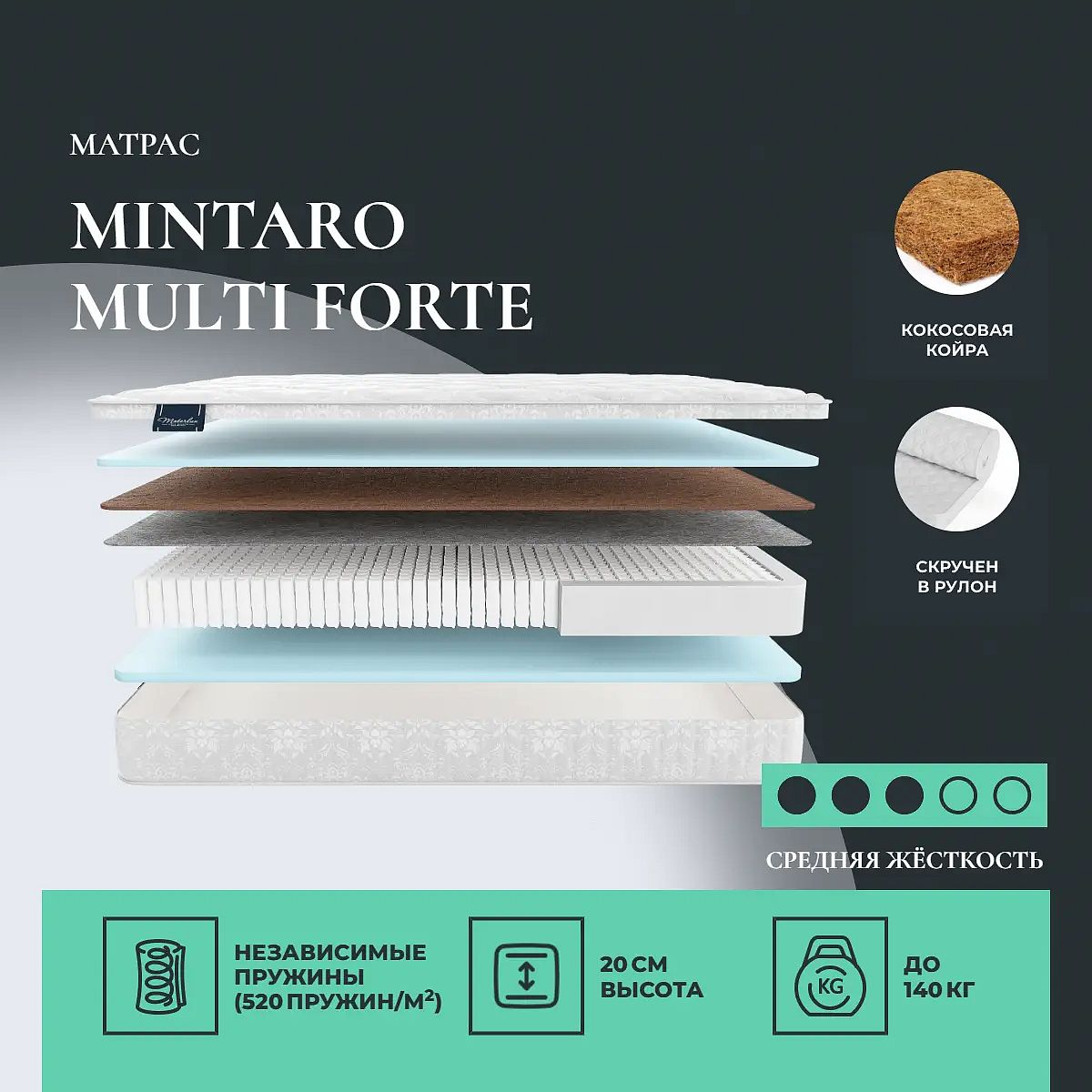 Матрас Mintaro Multi Forte может доставляться как в полноразмерном виде, так и в скрученном. Данный матрас можно свернуть на фабрике в плотный рулон. Скрученный матрас удобно перевезти на дачу или просто забрать из магазина. Свернуть матрас повторно так же компактно в домашних условиях невозможно.